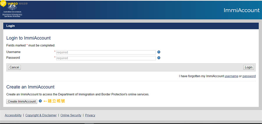 首先先進入澳洲簽證處第一次申請打工渡假簽證的網站之前,須要先到移民局申請個人的專用的Imm 帳號&密碼才可以申請簽證喔~