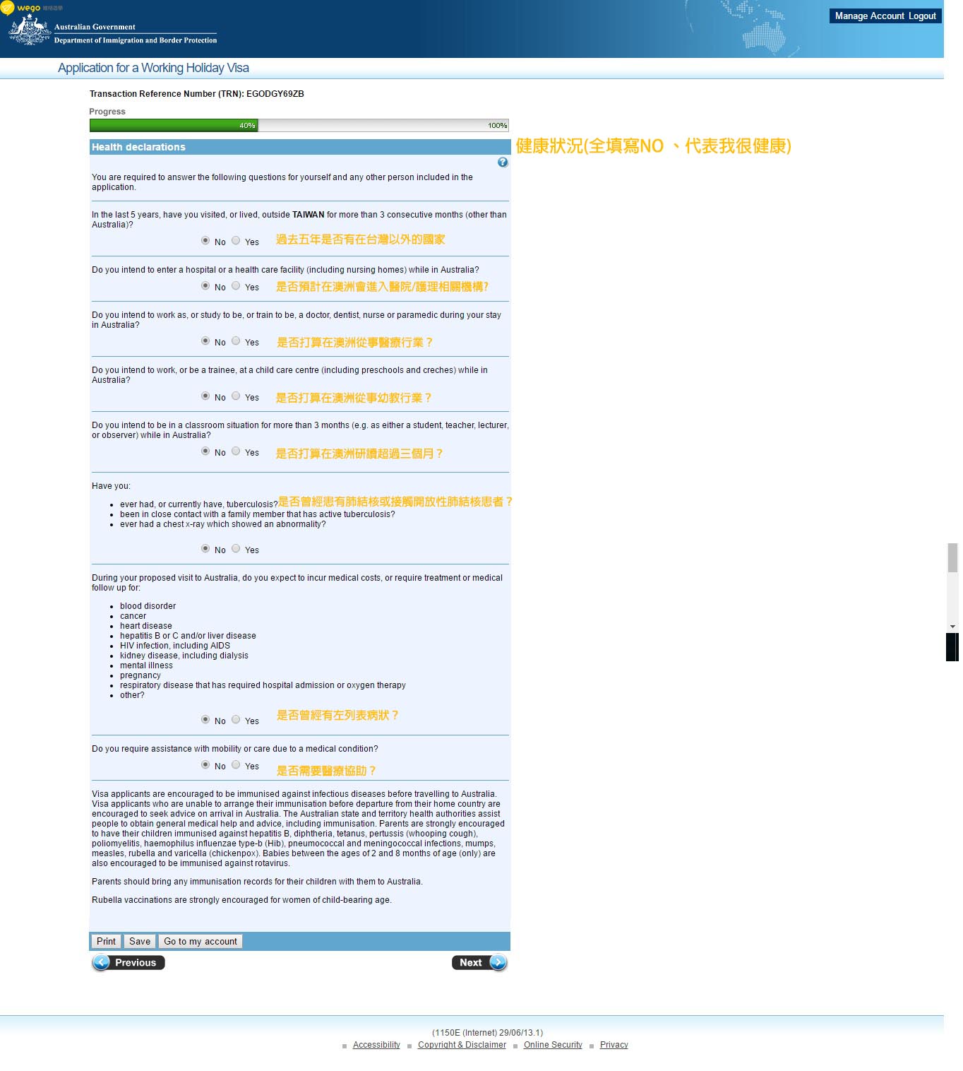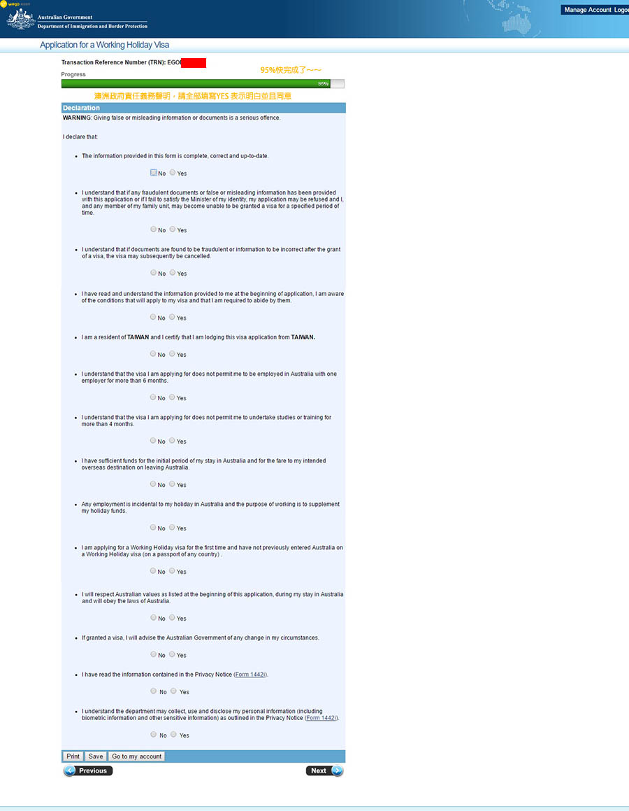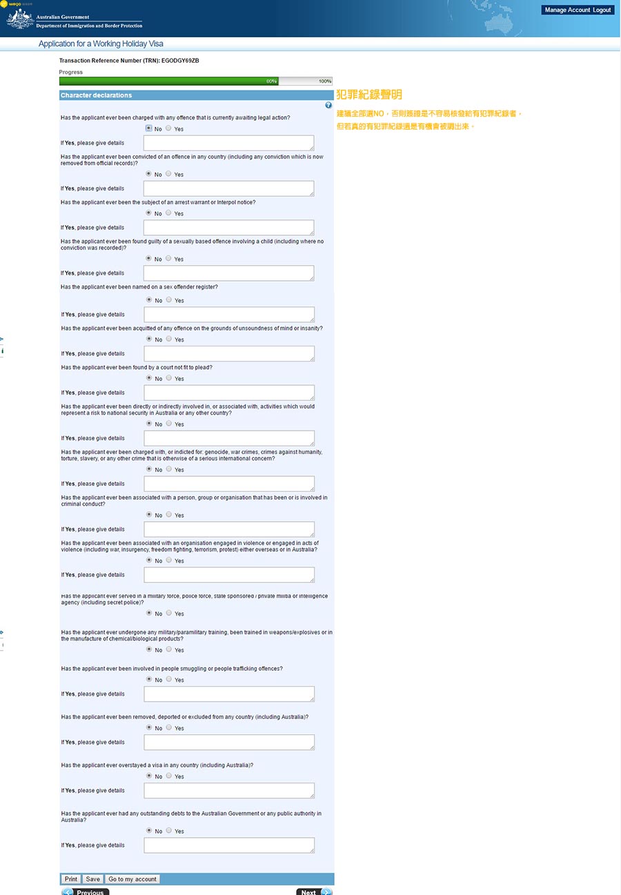 Page 15 了解澳洲打工簽證規範、規定 全填YES 「NEXT」下一步