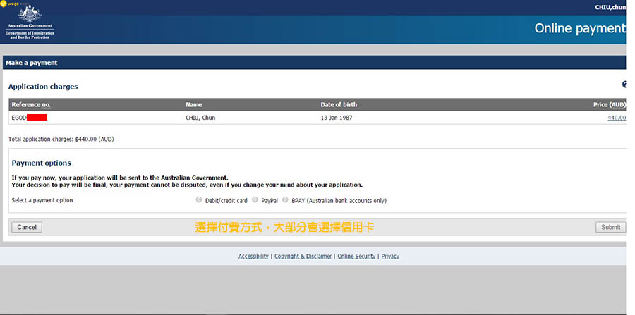 費用:AUD440 +AUD 4.75 tax =444.75 AUD (澳洲簽證現在都是電子簽證,所以沒有信用卡的人偷偷拿爸媽的信用卡起來刷看看吧)