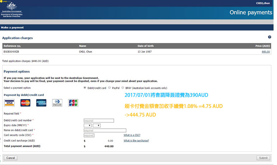 Payment Stage 進入刷卡付費畫面,目前2017上半年還是為440AU, 手續費會有4.75AUD(信用卡收1.08%)