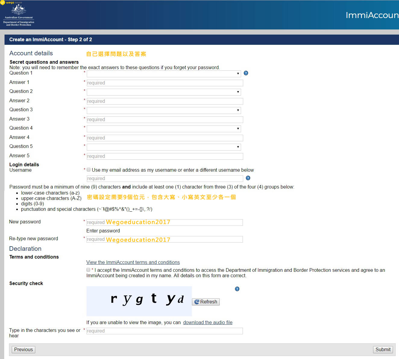 要使用自己的e mail 因為要收取認證信跟之後未來的簽證號碼、以及下面填寫問題+答案