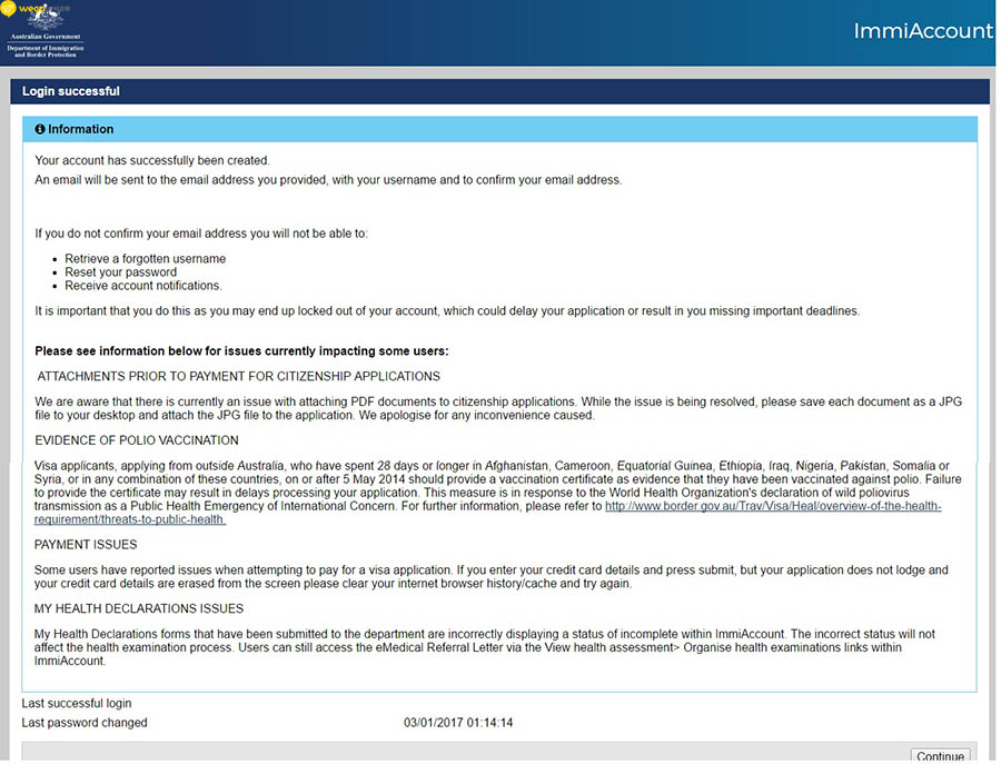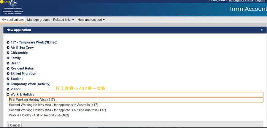 移民局帳號請謹慎記好,現在開始步驟是申請澳洲打工渡假簽證417、二簽或其他學生簽證