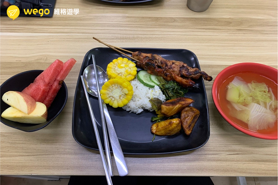 而午晚餐的話都會一定會有湯、水果、三四道菜、一兩道肉,有時候晚餐還會有麵包作為飯後甜點。因為這間是韓資學校,所以辣炒年糕、泡菜等韓式料理也很常見,不過調味常常讓人摸不著頭緒就是了。有些吃不慣這邊食物的人會叫外送,或假日去超市囤積泡麵,但我自己是吃一吃就習慣了。