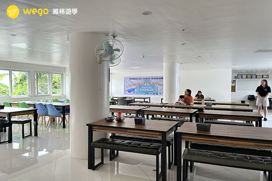 COCO English Academy 位於長灘島南部的寧靜地區,環境安靜適合專心學習。學校位於山丘上,能俯瞰整個長灘島,景色優美。學校擁有渡假村風格的建築設計,校園內綠意盎然,提供輕鬆舒適的學習環境。