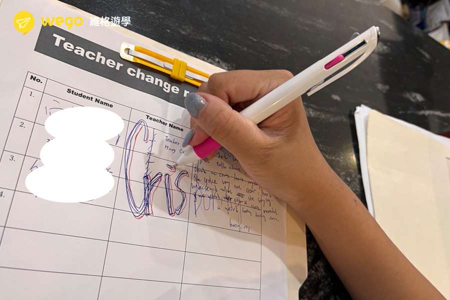 換老師是個很好的功能,同時也非常重要,我總共換過兩位老師。必須說其實大部分老師都很友好,上課很活潑,課程內容也很有彈性,但還是會有極少數跟你比較合不來的老師…只要每個禮拜四結束前到櫃檯的teacher change登記表填寫你的名字,老師名字和理由,下禮拜老師就會被換掉,而你就會有新課表了。