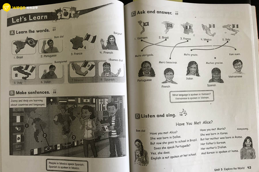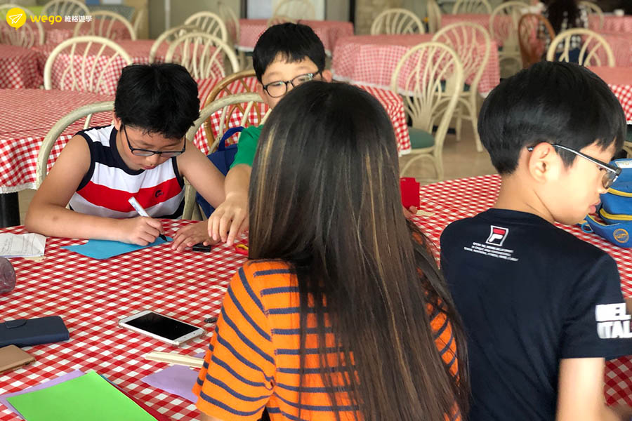 學生們會先一起討論圖片上的內容,最後再來作答,作答過程老師也能確認學生能把想法都說出來,最後再把討論出來的答案寫出來,在課堂中學生能盡情地討論表達自己的想法,跟各國不同的青少年做交流