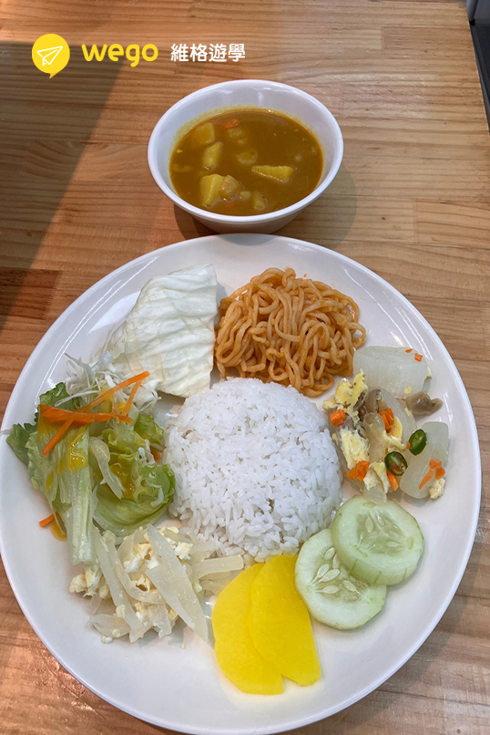 學校食堂雖然說是素食友善,但還是不建議嚴格素食的同學。我吃的比較隨便,沒有那麼嚴格,但蔬菜常常跟很腥的肉煮在一起,我還是蠻難接受的。基本上沒有多少蔬菜,最常出現的是豆芽菜,還蠻好吃的。其他的肉食朋友看起來沒什麼怨言,就是比較鹹。噢!學校每天都有提供生菜,喜歡生菜的朋友有福了。搞不好是因為我不喜歡生菜,才覺得在這裡吃素困難。