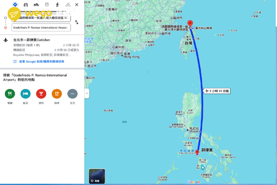 - 從台灣桃園國際機場直飛卡提克蘭機場(Caticlan Airport)。