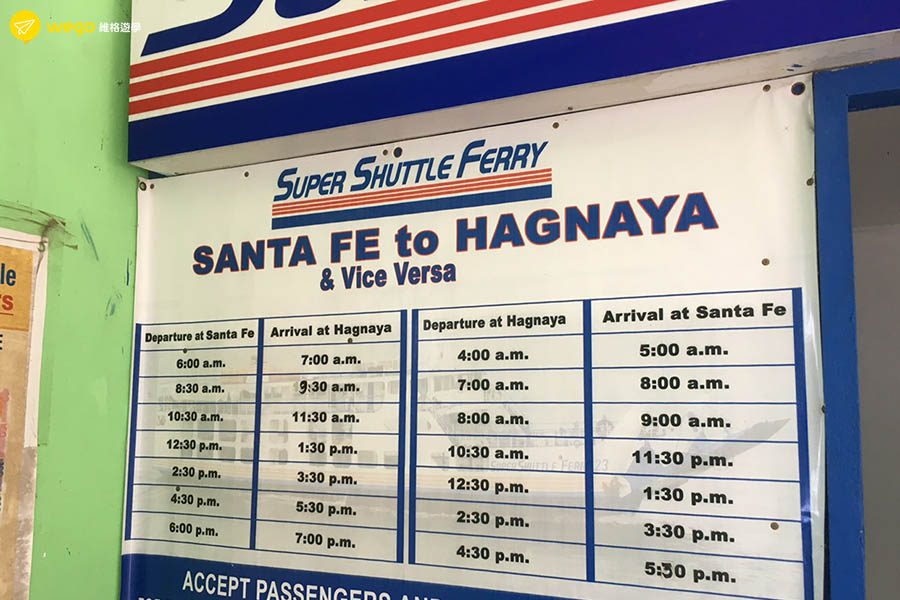 Hagnaya是宿霧北邊的港口,乘船前往Bantayan島大約1小時30分鐘,船票為170P加上港口的terminal fee 10p總共為180P,船的時刻表如下圖。