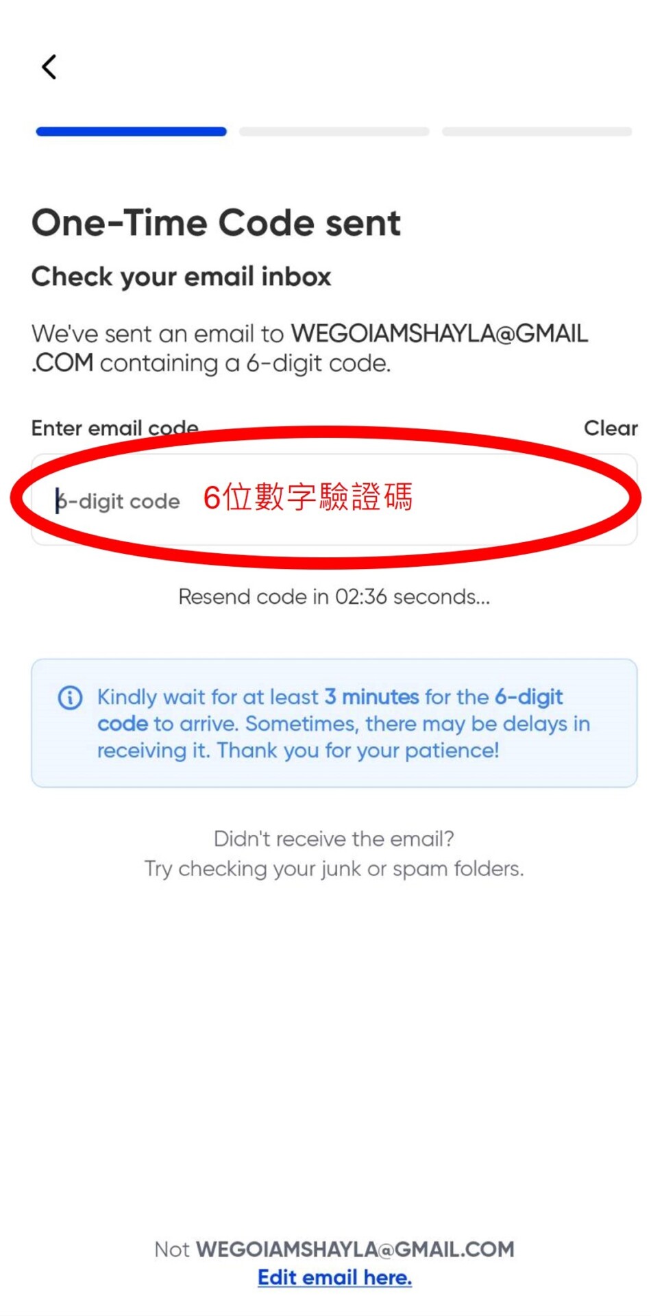 3. 接下來到我們剛剛填寫電子信箱收取驗證碼,並輸入6位數的驗證碼。![]() |