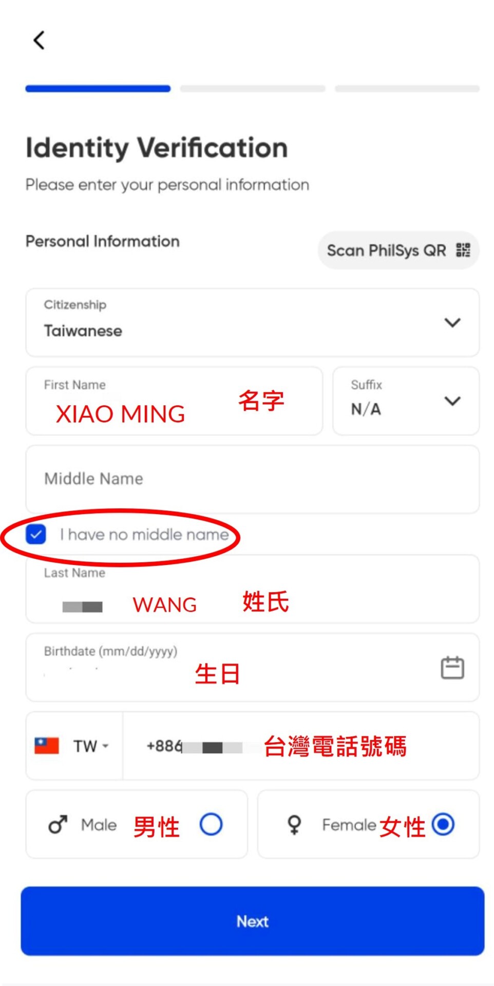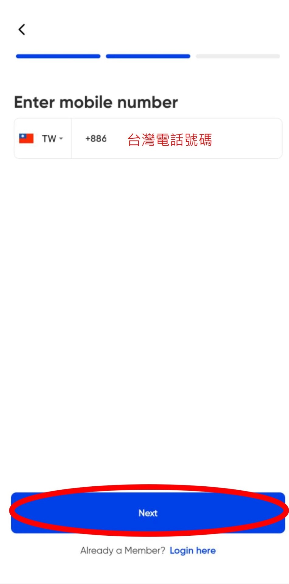 4. 輸入台灣的電話號碼。輸入完選下一步。![]() |