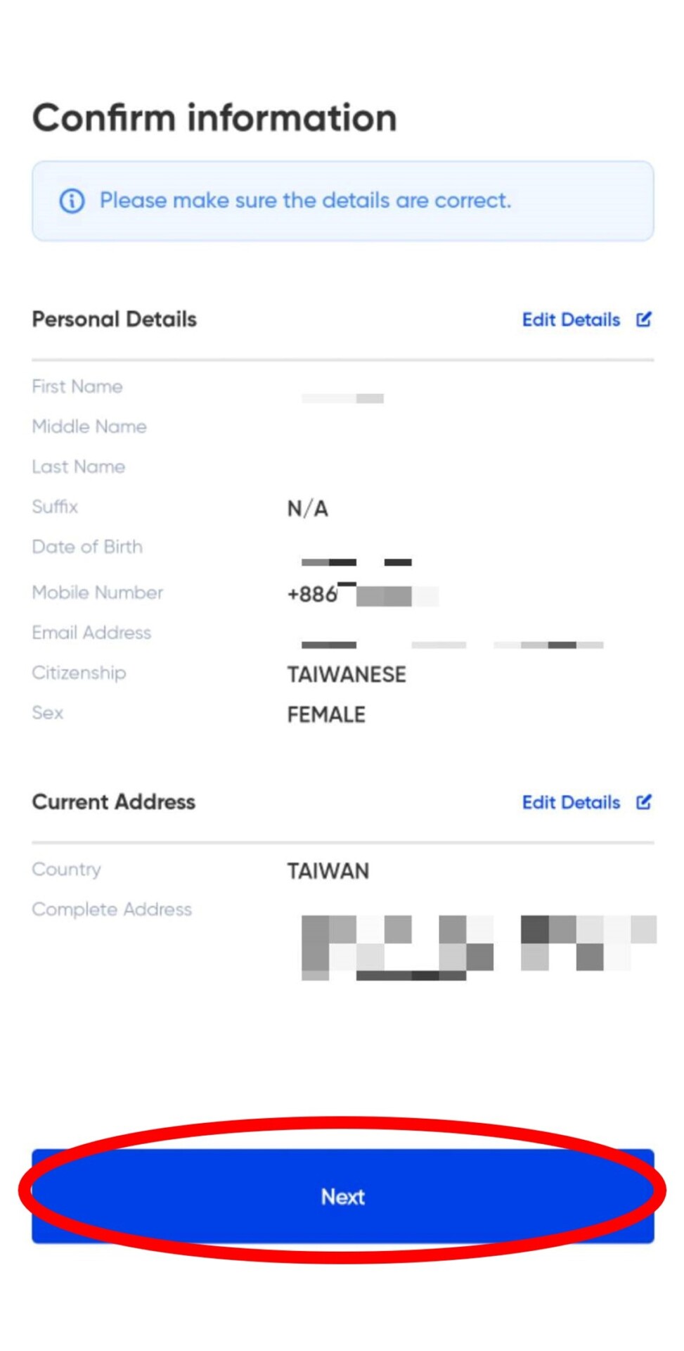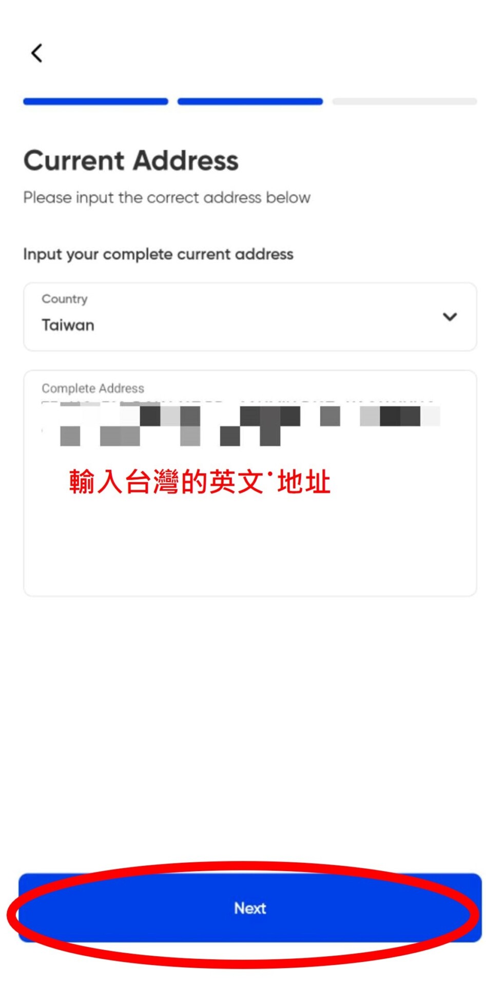 7. 輸入台灣英文地址,輸入完畢後,接著核對你的資料,如果沒有錯誤,選擇下一步。