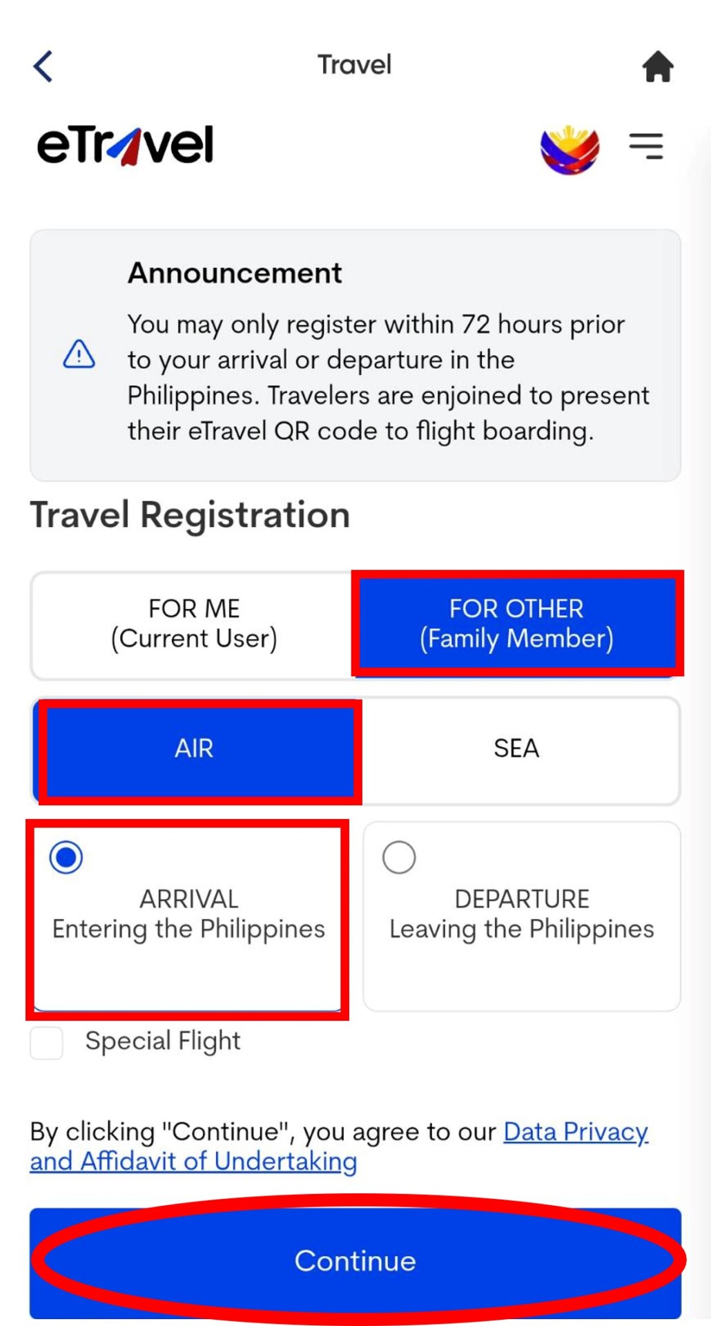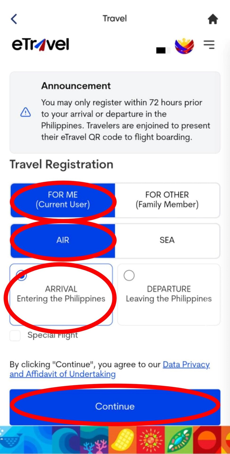 12. 選擇創立新旅程點選〝New Travel Declaration〞。接的點選〝For Me〞和下面的〝AIR〞及〝ARRIVAL Entering the Philippines〞後選〝Continue〞。
