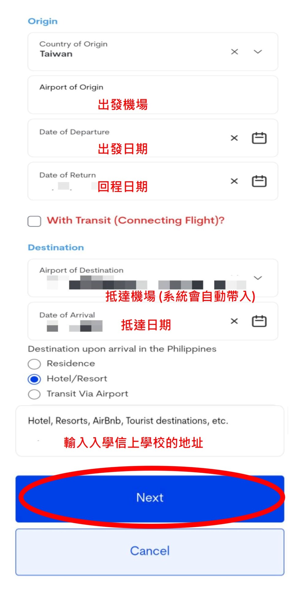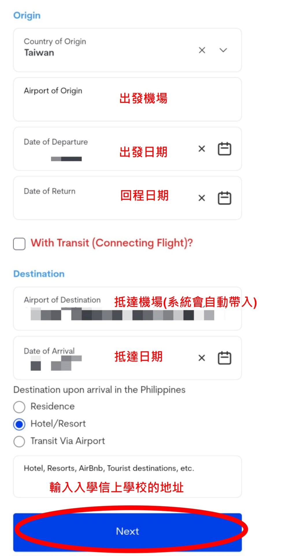 3. 填寫國家及台灣的英文地址後按下一步。輸入小朋友搭乘的航空公司名稱及班機號碼,出發機場、出發日期、回程日期、抵達日期及入學信上學校的地址。接著選擇下一步。
