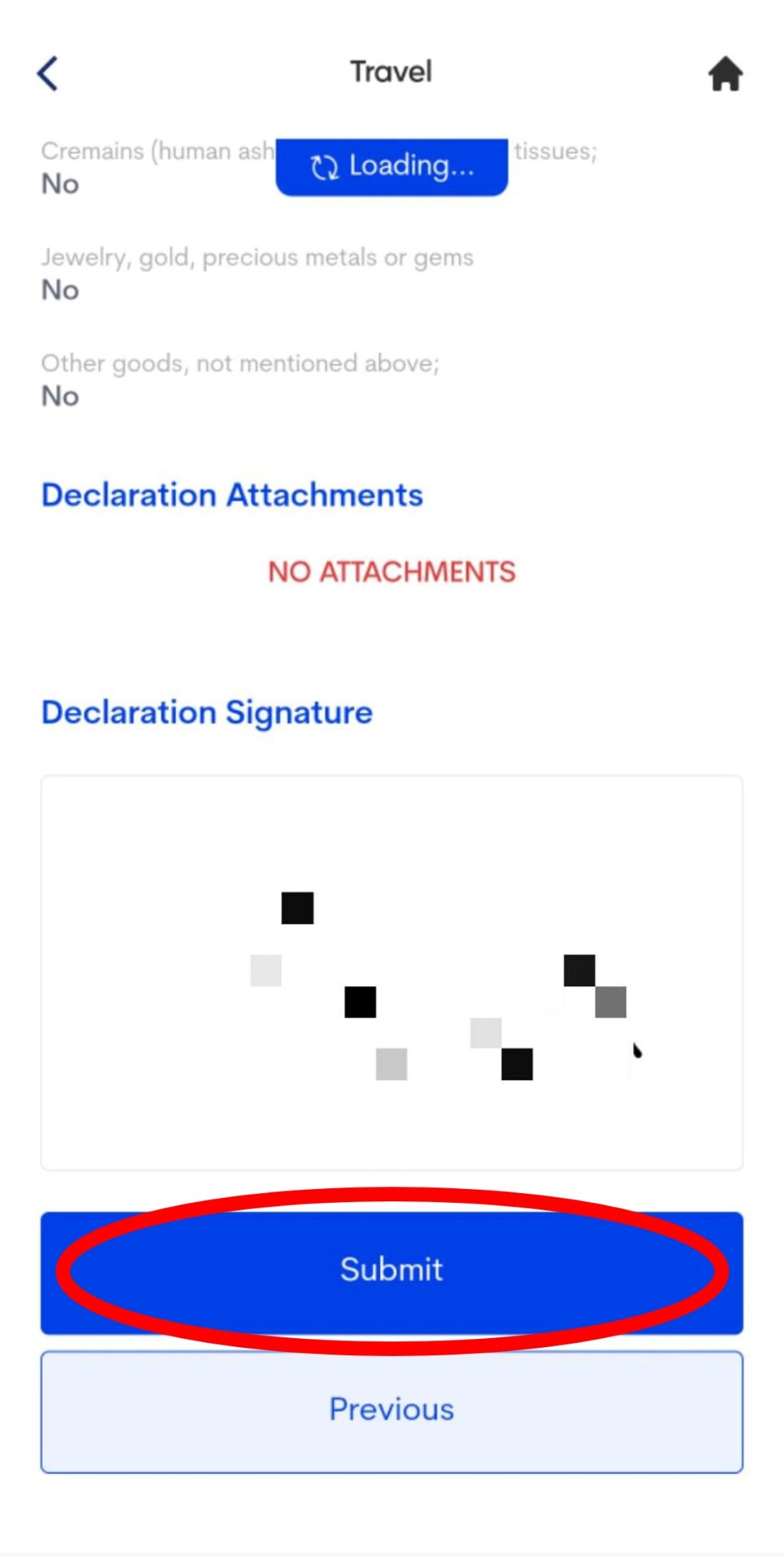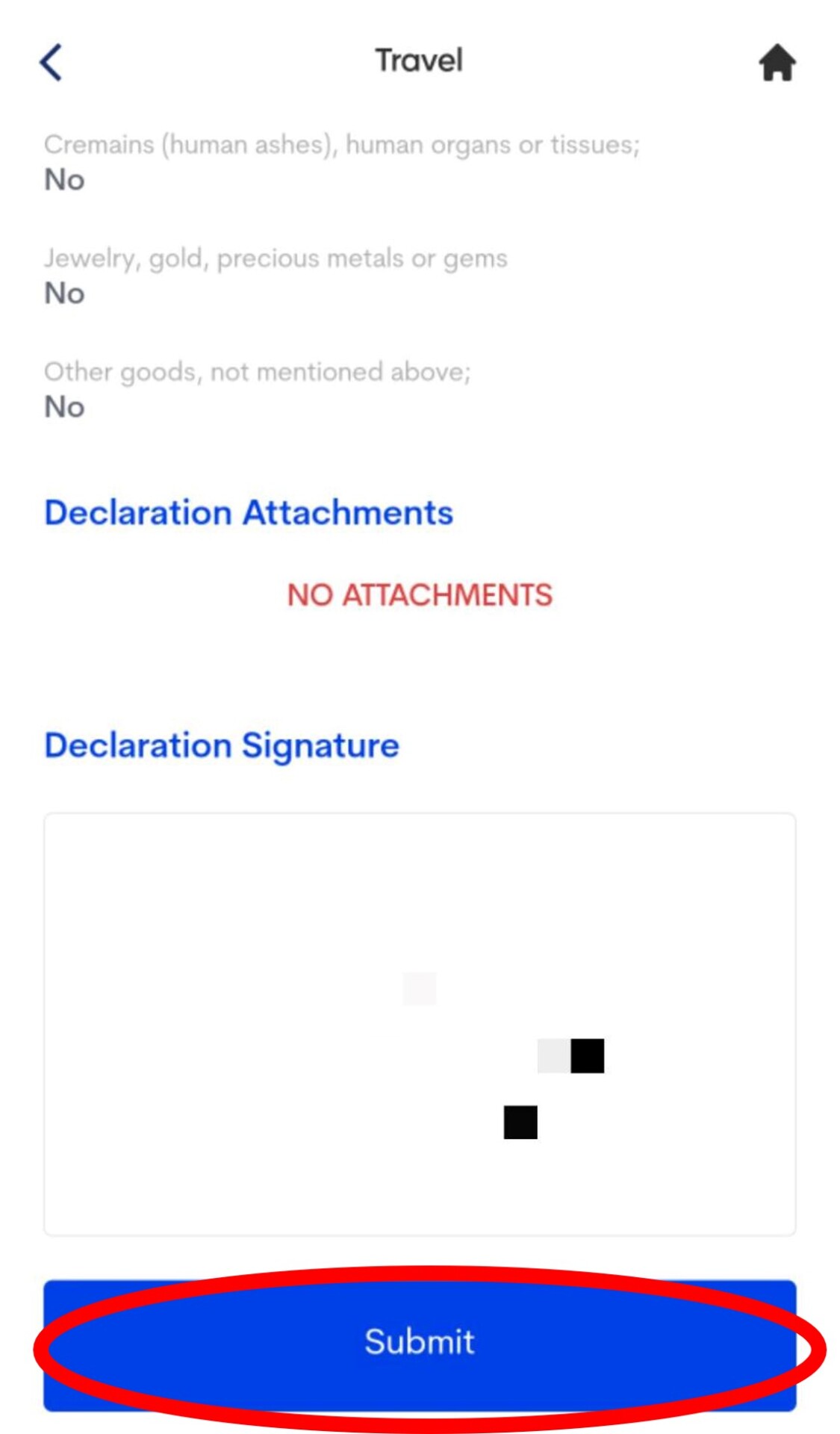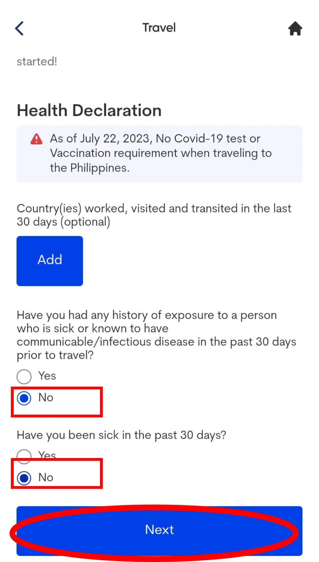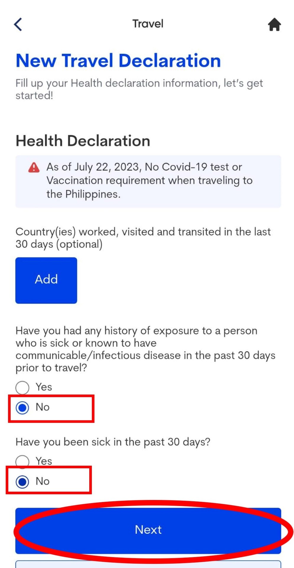 4. 填寫健康聲明。填寫NO後按下一步,再滑到最下方選YES。