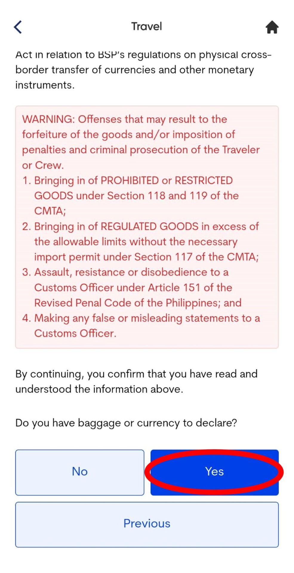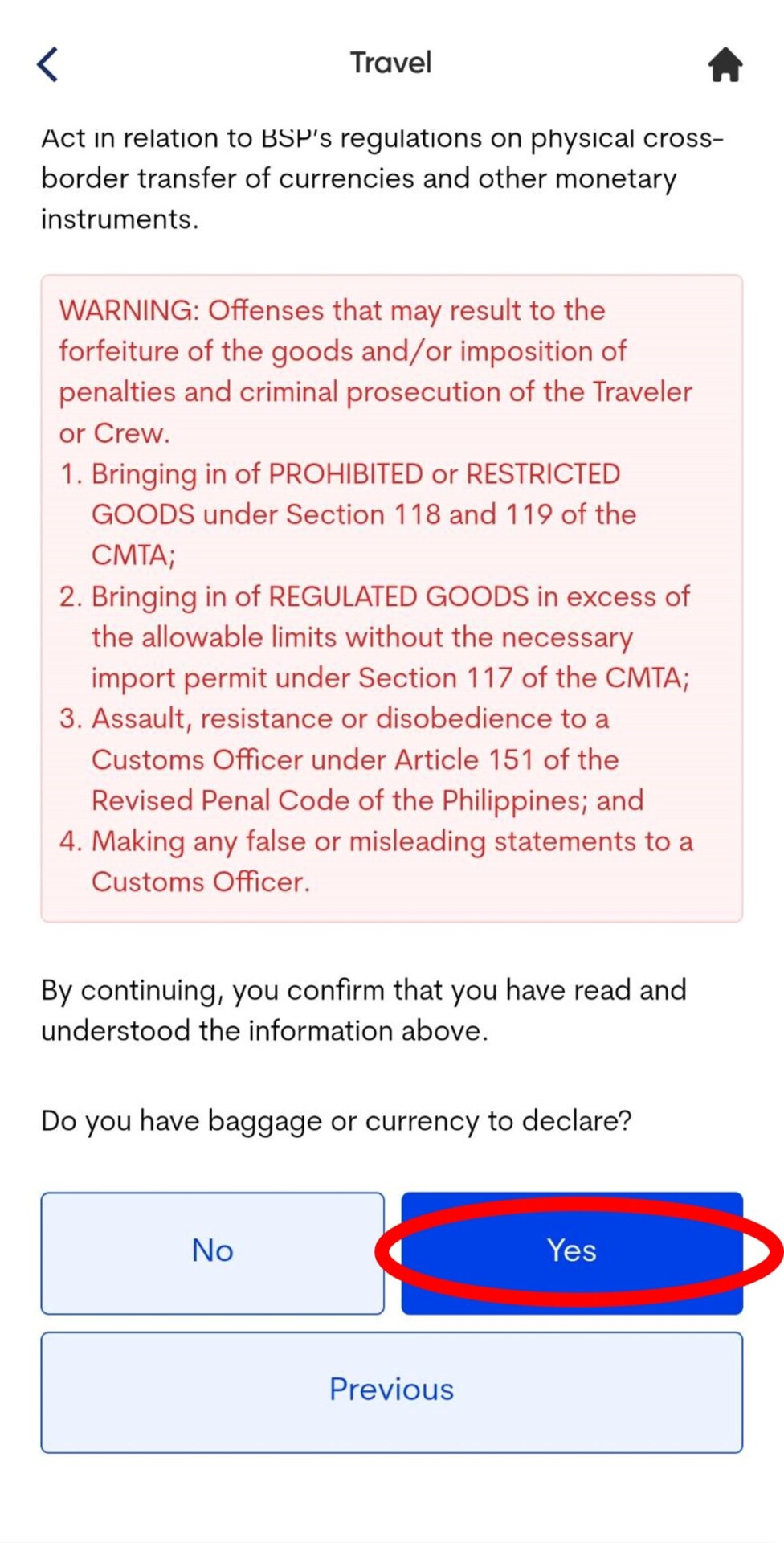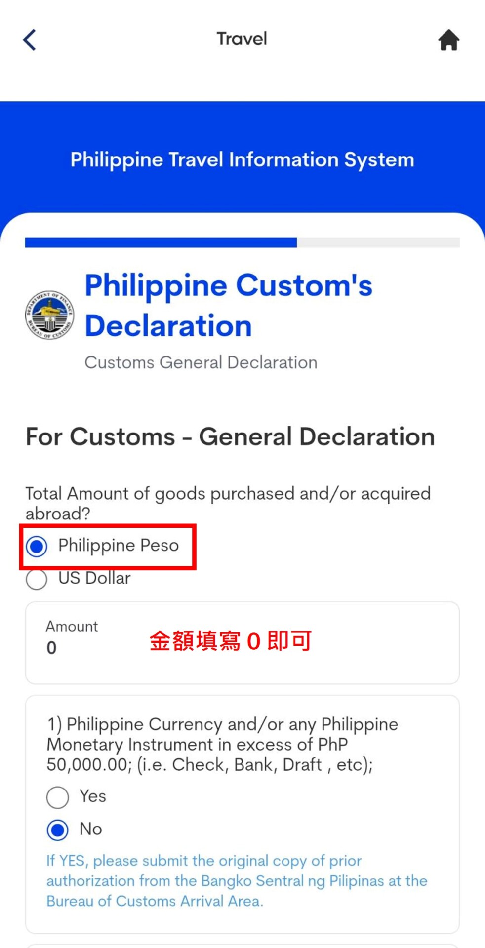 5. 填寫托運行李及手提行李數,基本上都是1件。是否為第一次入境菲律賓,如果是第一次入境,請填寫YES,如果曾經有入境菲律賓請填選NO。選下一步,請點選〝Philippine Peso〞,金額填〝0〞 ,接下來1-12選項都填寫NO即可,簽名欄位簽中英文字都可以喔。