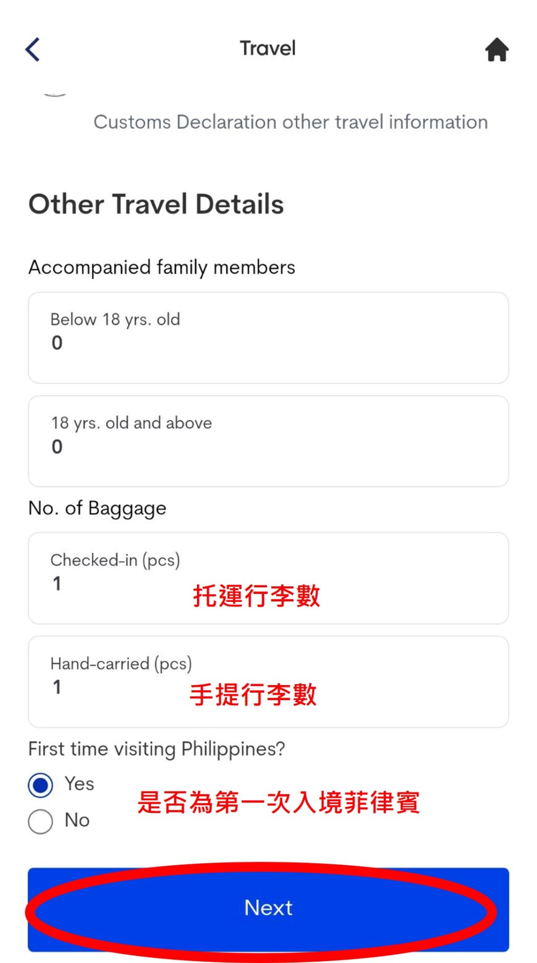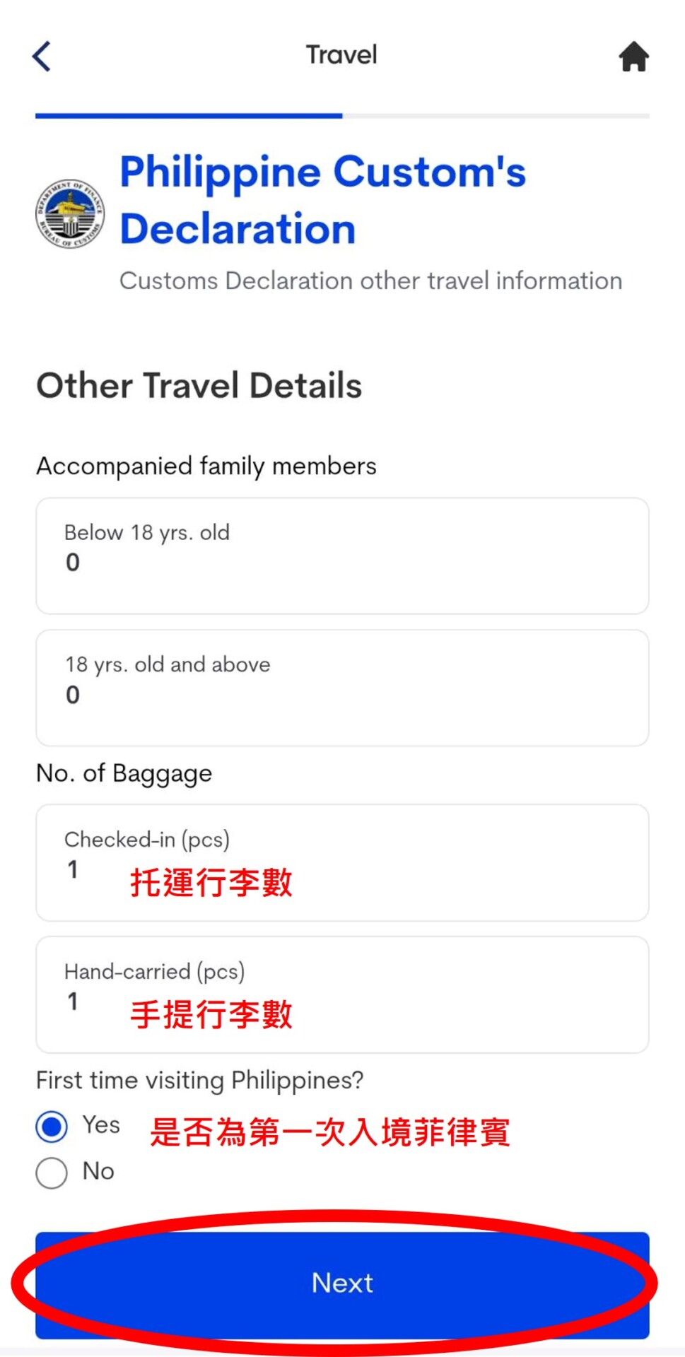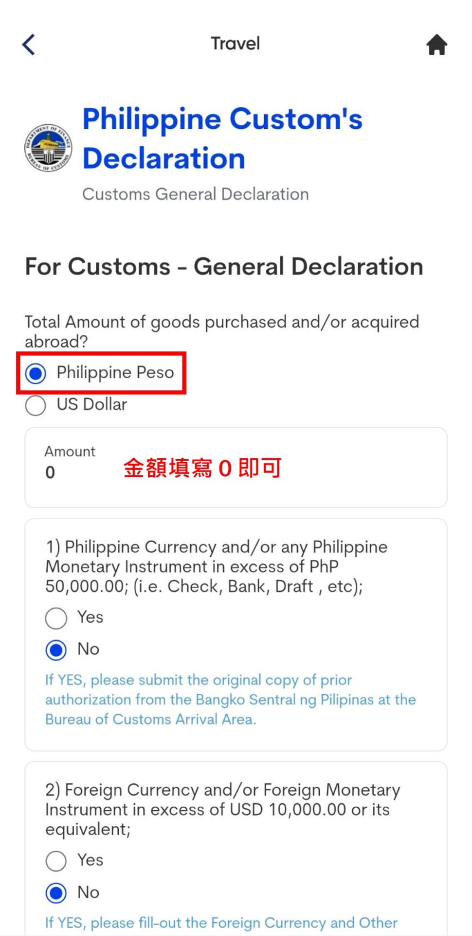 15. 填寫托運行李及手提行李數,基本上都是1件。是否為第一次入境菲律賓,如果是第一次入境,請填寫YES,如果曾經有入境菲律賓請填選NO。選下一步,請點選〝Philippine Peso〞,金額填〝0〞 ,接下來1-12選項都填寫NO即可,簽名欄位簽中英文字都可以喔。