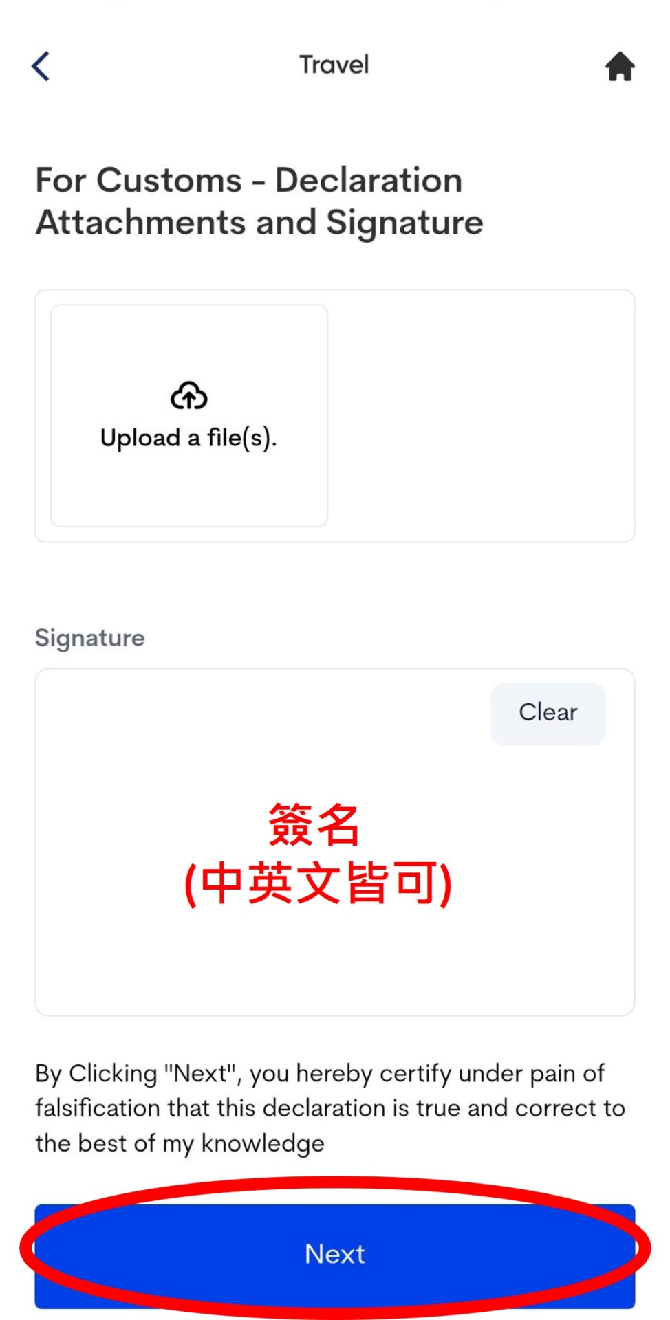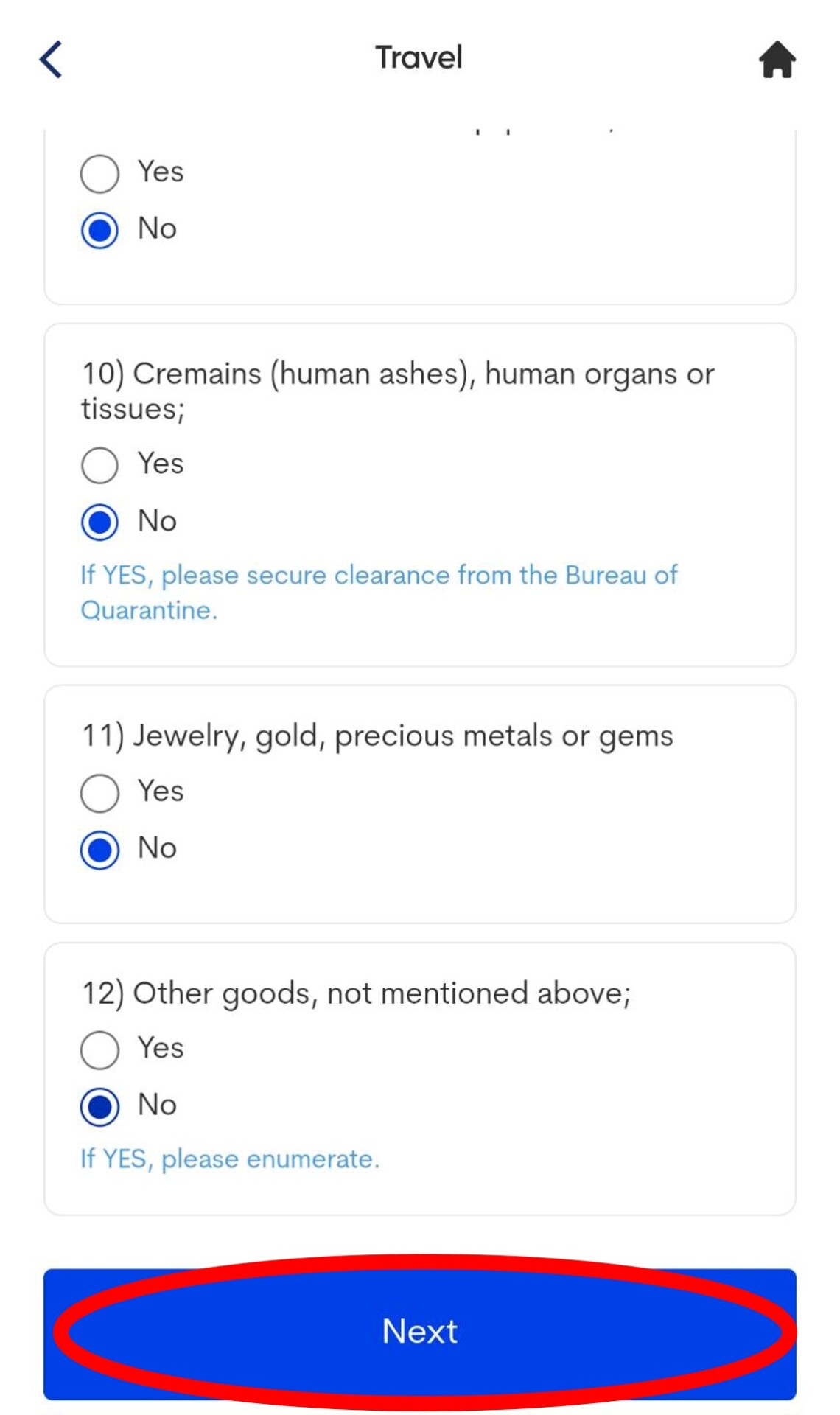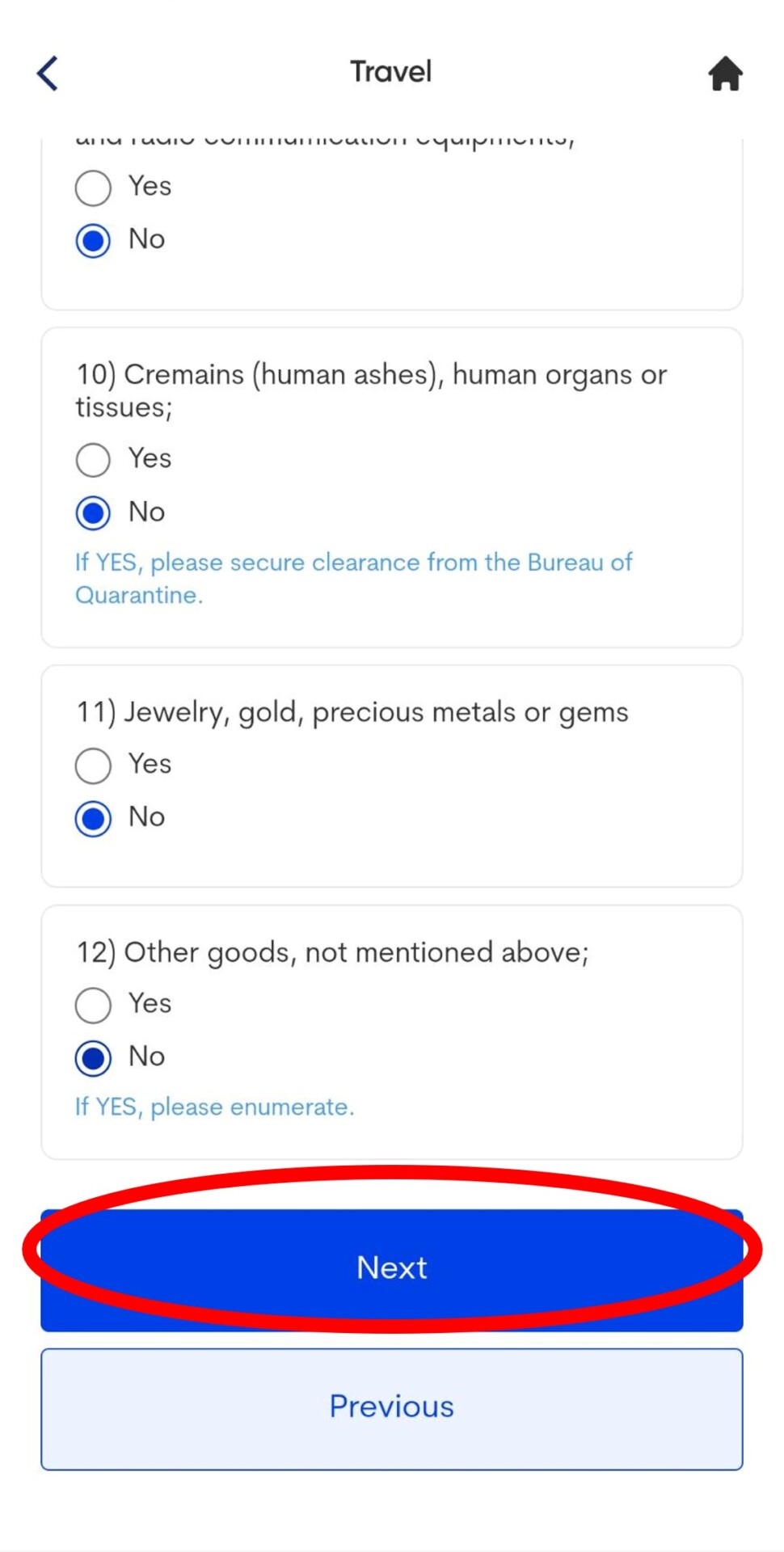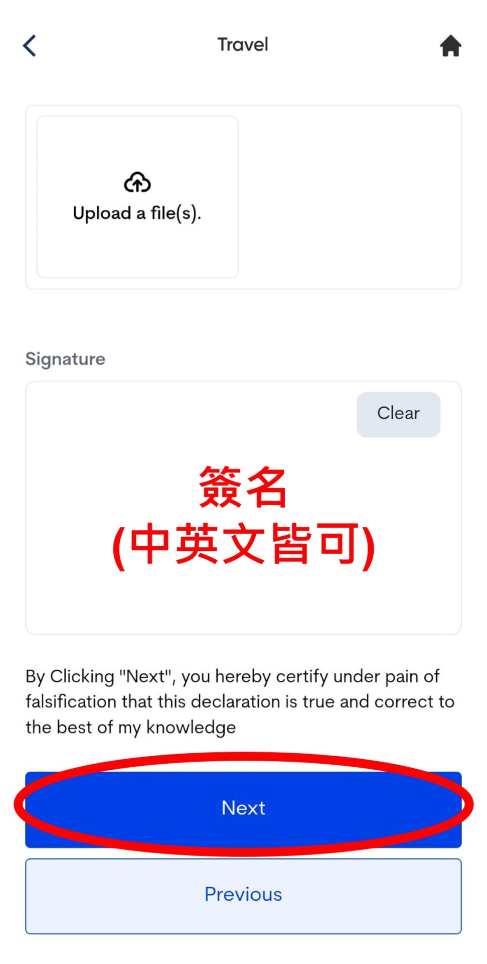 14. 接下來填寫建康聲明。填寫NO後按下一步,再滑到最下方選YES。