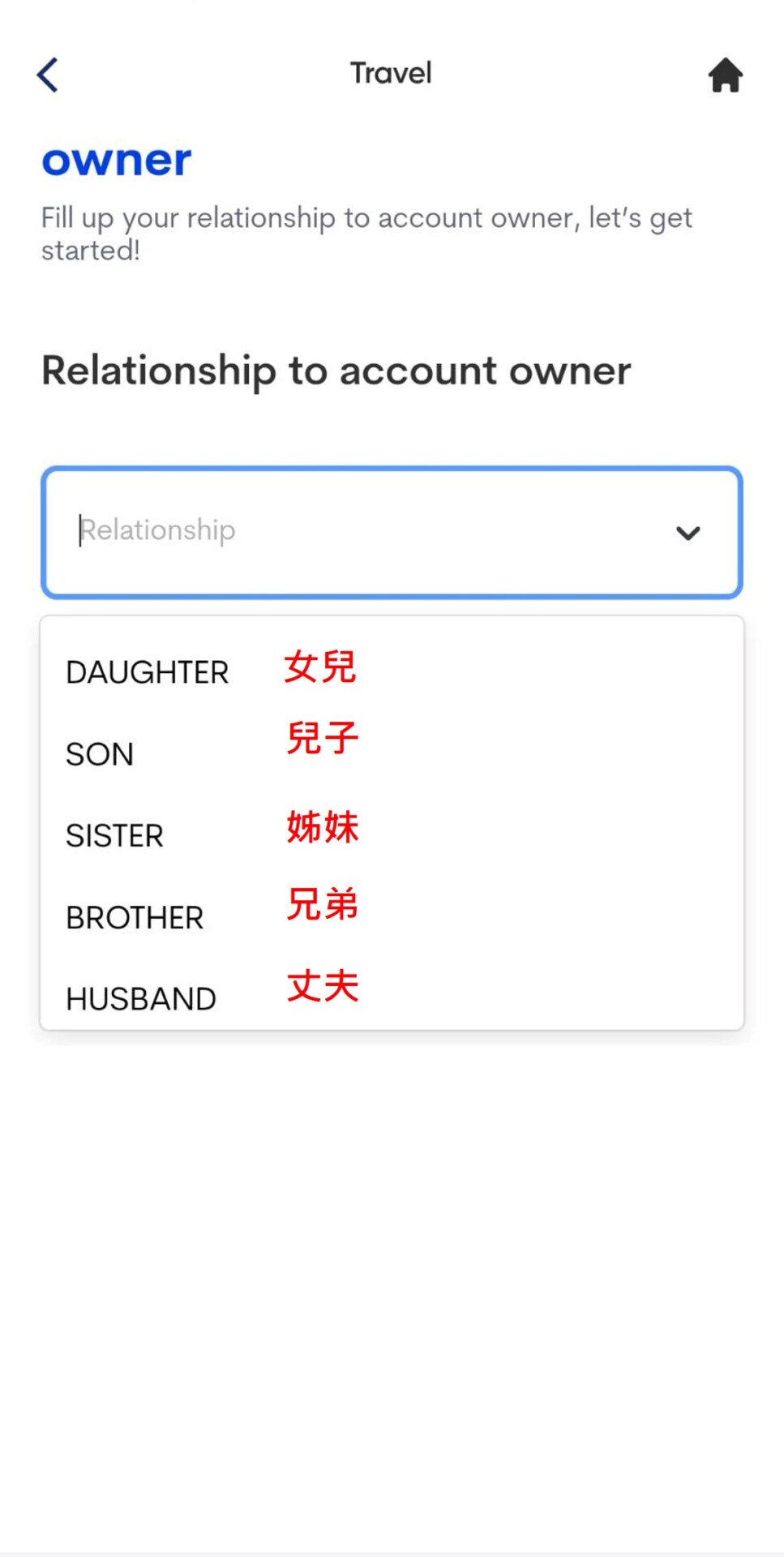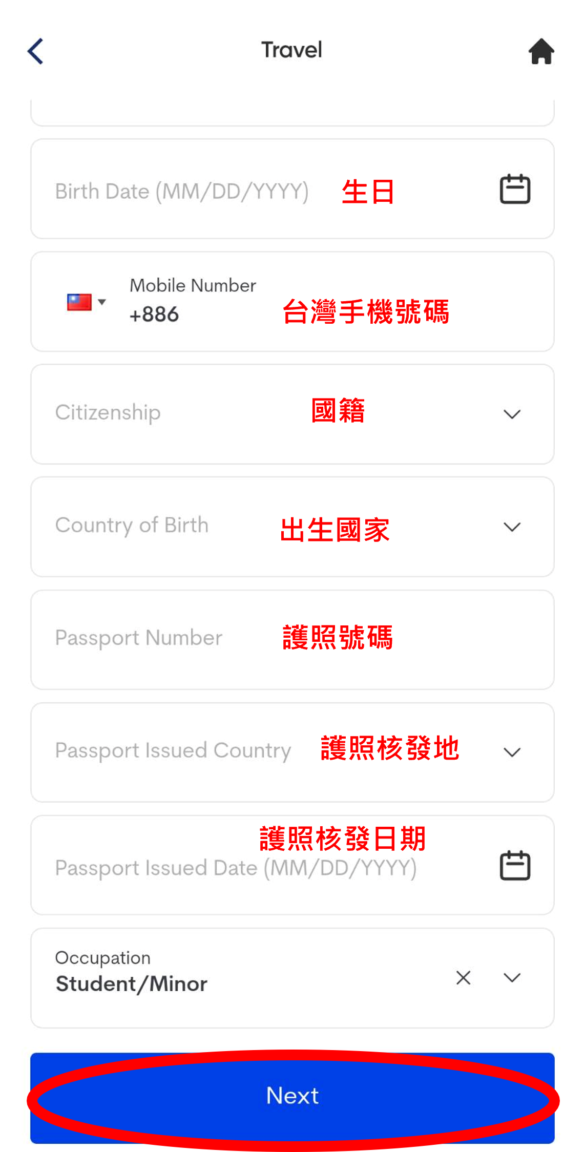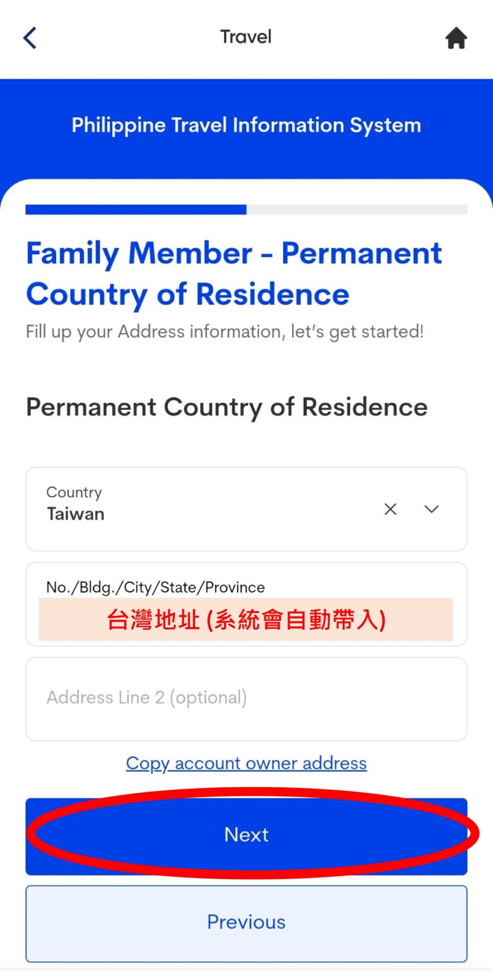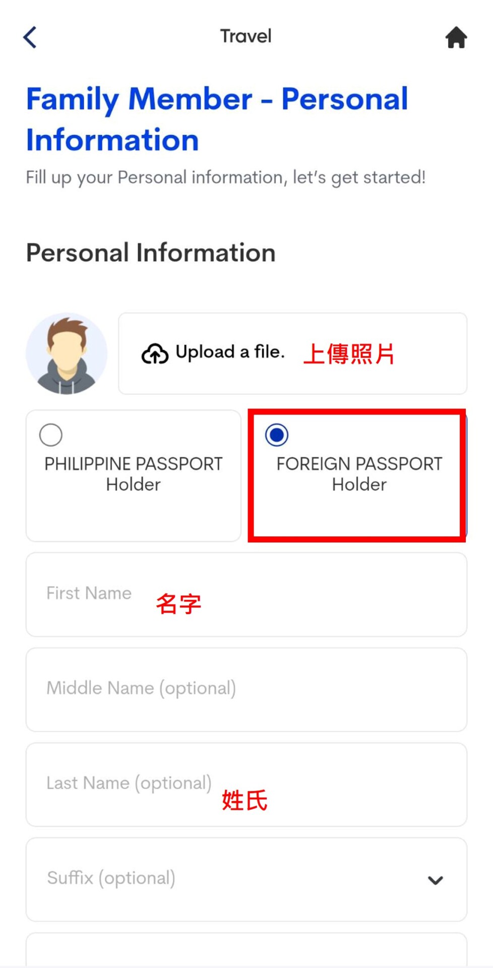 2. 填寫家庭成員資料並上傳照片,名字、姓氏、性別、生日、護照號碼、護照核發日期、職業,填寫完後選擇下一步。系統會自動帶入台灣英文地址,接著填寫家人和自己的關係,按下一步後會出現家人的資本資料。