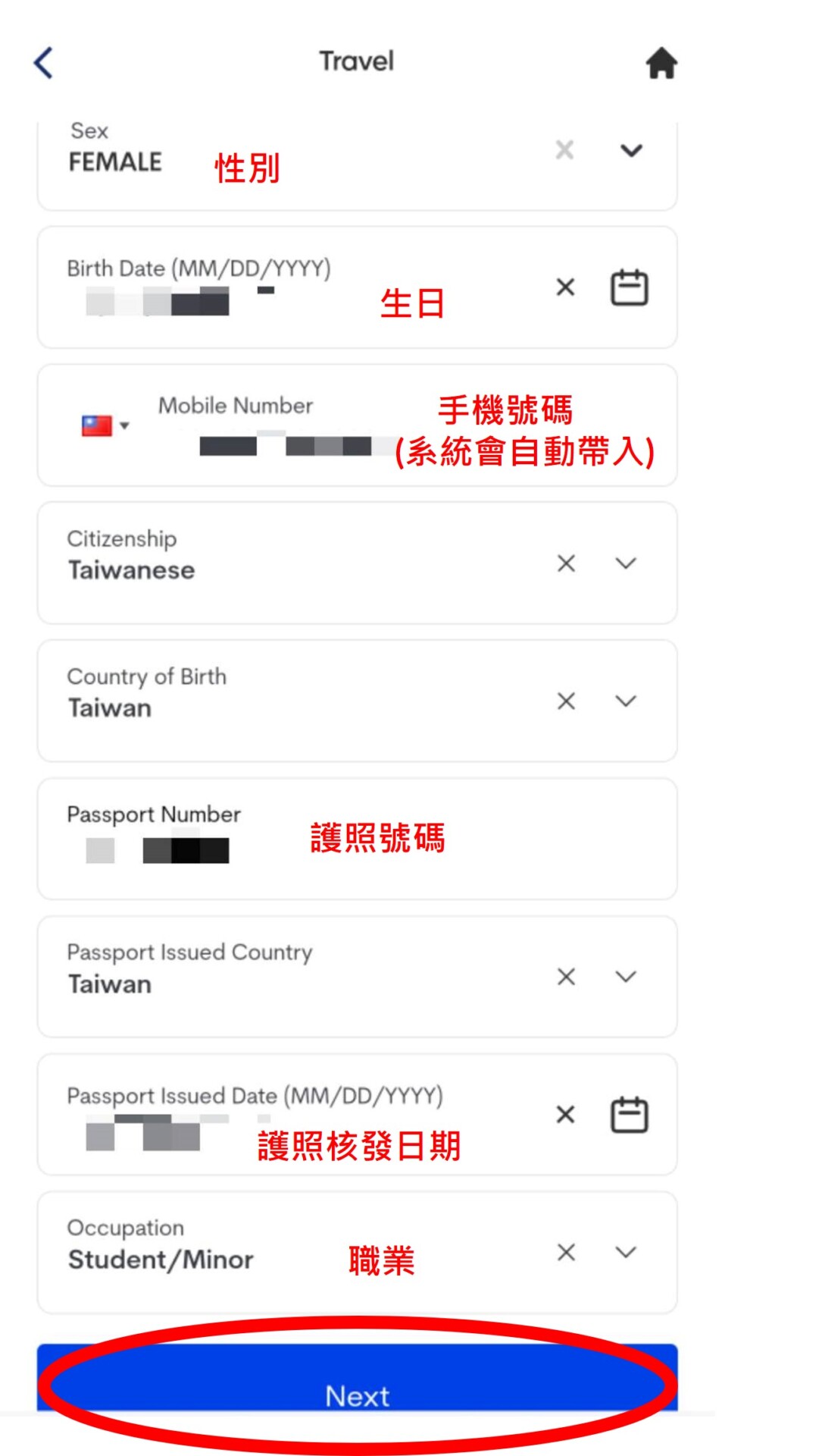2. 填寫小朋友基本資料。先上傳大頭照,選擇〝FOREIGN PASSPORT Holder〞後填寫小朋友護照資料,不需填寫Middle Name。填寫名字、姓氏、性別、生日、台灣手機號碼、國籍、出生國家、護照號碼、護照核發地、護照核發日期及職業。接著選擇下一步。