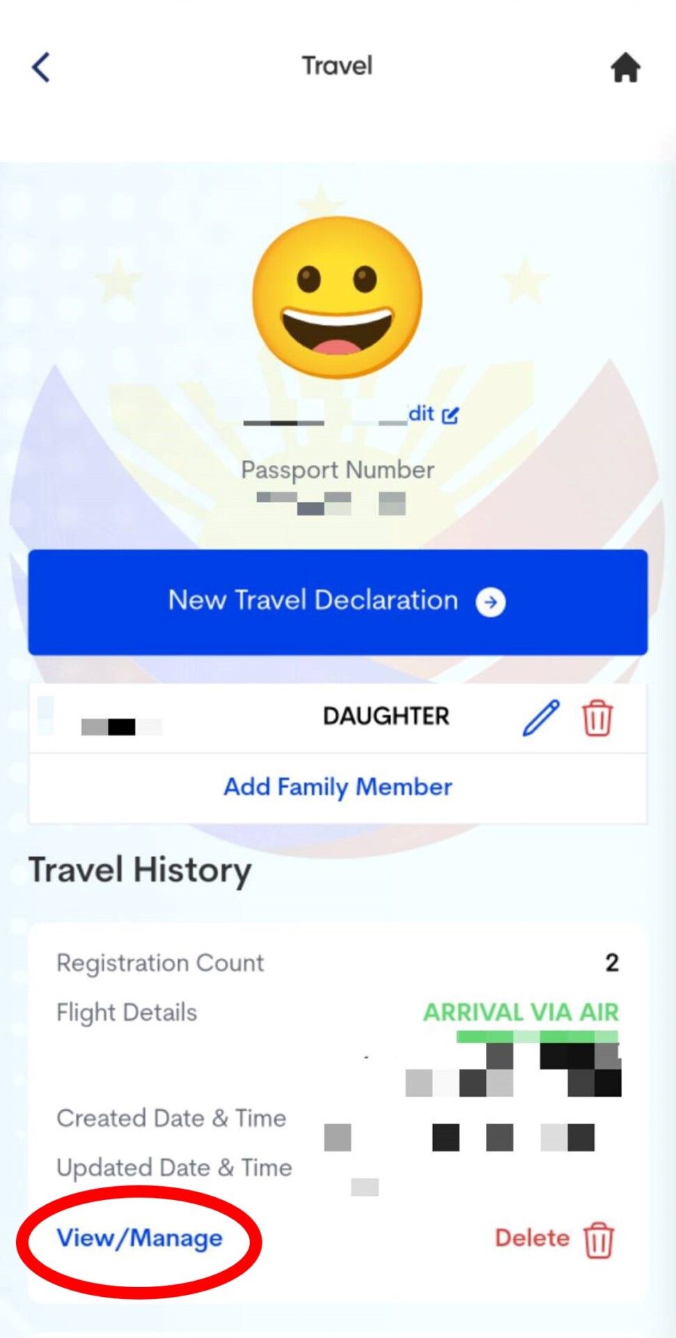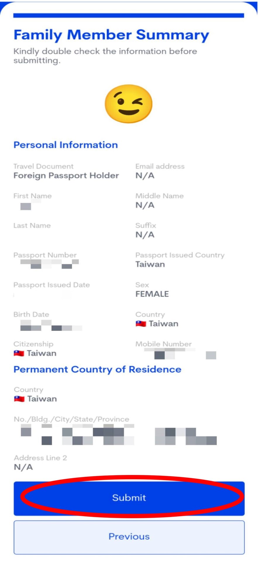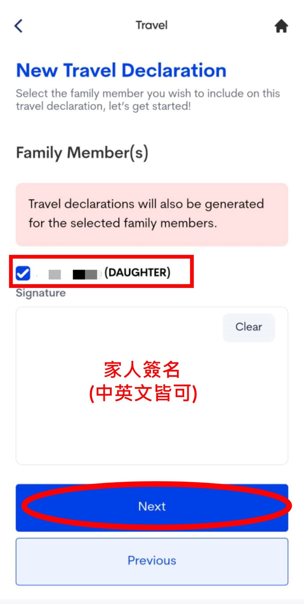 3. 核對家人的基本資料,確認完後選〝Submit〞。會看到自己的畫面,選擇〝View/Manage〞會回到步驟13的畫面,但不用擔心需要重新填寫資料,皆只需選擇下一步就可以喔!直看到家人簽名的畫面,把名字打勾並簽名後選下一步,會出現你與家庭成員的資料,我們只要選擇〝View/Manage〞即可下載QR-Code囉!!