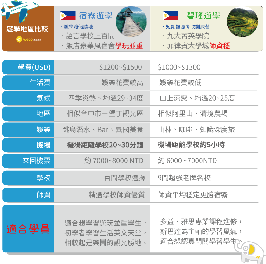 菲律賓目前熱門遊學地區,宿霧就是一個熱門遊學地點,7成學生暑假都是指定想要宿霧地區遊學,遊學定義其實也是『遊玩當地,體驗國外不同環境人文風情,也一併學習英文成長』不一定完全是只有學英文的目的,在這裡可以完全體驗到世界遊學大熔爐。Wego曾經寫了一篇詳細的「碧瑤與宿霧遊學大比較」,受到很多學生喜歡,可供給大家參考。