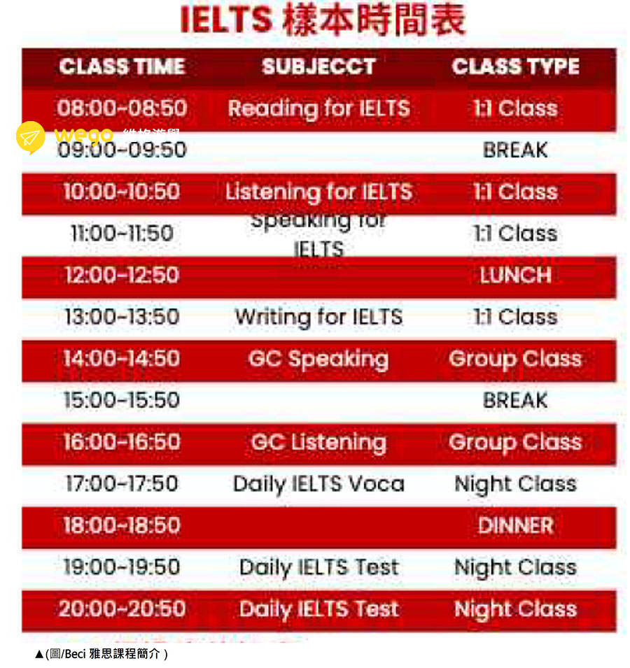 Beci雅思課程每天必需參加三堂的夜間課程,周一到周四會有,一小時的單字課及兩小時的模擬考,隔日的一對一課程會做模擬考的檢討。週五夜間課程複習文法。