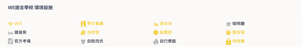 | 設施 | 游泳池,自習區,餐廳,健身房 | 戶外健身房、球場、咖啡廳 | 遊戲室,健身房,游泳池 | 學生住在怡朗高級住宅區內有泳池健身房 |