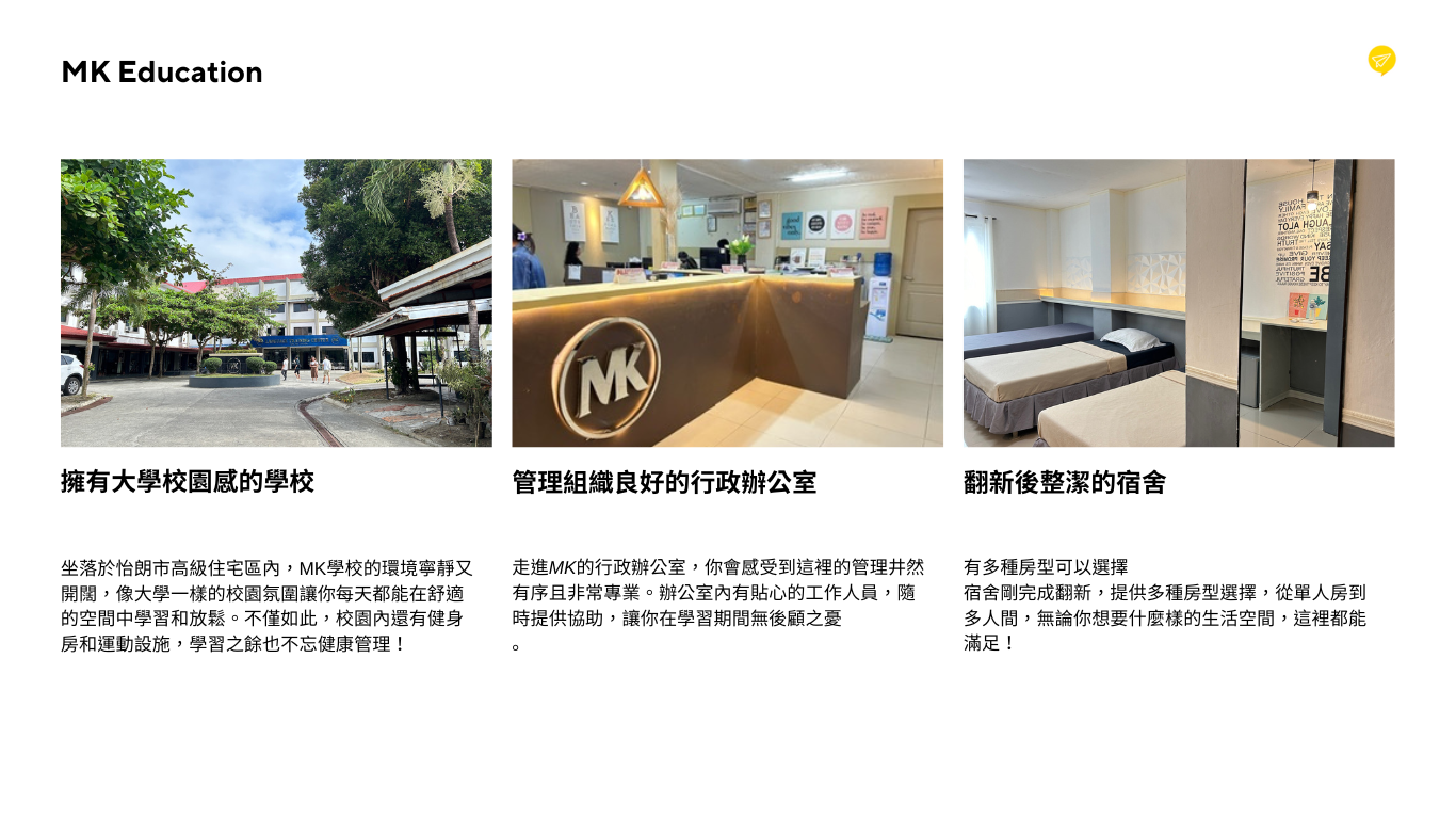 MK Education 充滿大學感覺的活力的校園,這裡不僅是學習的殿堂,還是心靈的遊樂場。能在安全的校園內、咖啡廳裡釋放身心,與不同國籍的朋友交流,感受文化的碰撞與融合。因假日學校都會舉辦旅遊或動!這裡適合那些追求學習與生活平衡的年輕靈魂。