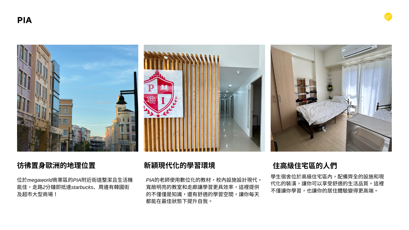 PIA 語言學校是怡朗唯一一所擁有現代化設施的語言學校,學校的設計和住宿條件與歐美的語言學校相似,讓學生在菲律賓也能體驗到國際化的學習環境。學校位於怡朗的 MEGAWORLD 商業區,教學區與學生宿舍僅一街之隔,提供方便的學習與生活條件。PIA 語言學校源自於韓國線上英語教學集團,並擴展至實體教學領域,採用系統化的教材進行教學,學生能通過線上和線下相結合的方式進行互動學習。另外,學校附近有星巴克和大型購物中心,方便學生在學習之外享受生活的便利。
