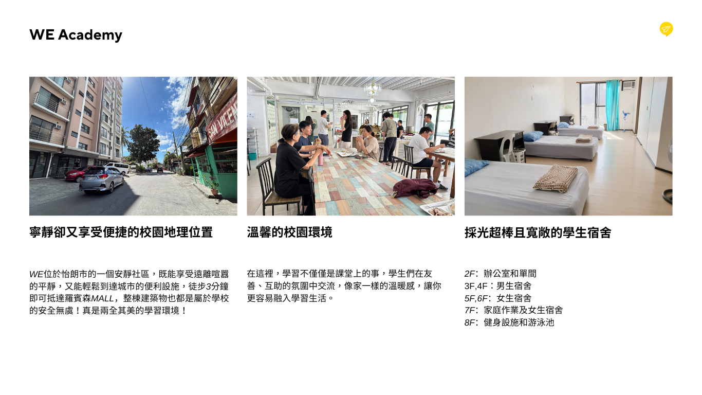 WE Academy 是怡朗一所小而美的語言學校,學生容納人數約為80~100人。致力於為學生提供最高質量的教育。學校位置便利,距離菲律賓著名的長灘島僅數小時的路程,學生可以在這裡享受到平衡學習與休閒的生活方式。學校的氛圍非常溫馨,學生、教師和工作人員之間相處融洽,讓人倍感親切。WE以一對一的教學方式課程架構考試及ESL價格相同,每天最多提供6小時的一對一課程,特別適合那些有預算限制且希望接受長期密集訓練的學生。學校通過菲律賓教育部 TESDA 認證,並持續創新教學方法,為學生提供舒適且專業的學習環境。此外,校區周圍設施完善,距離購物中心、超市和咖啡廳僅幾步之遙,讓學生在學習之餘也能輕鬆享受日常生活。