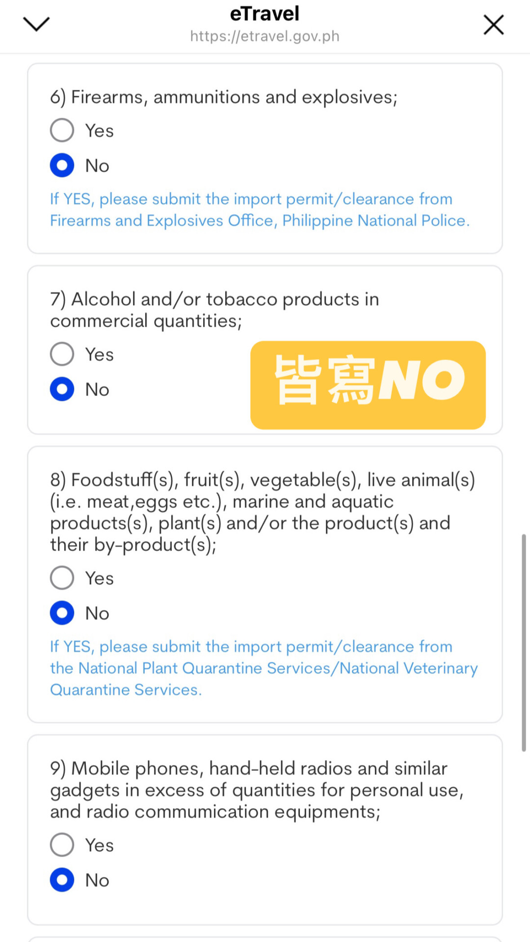 14.海關申報部分,滑到底選”YES”進行下一步驟
