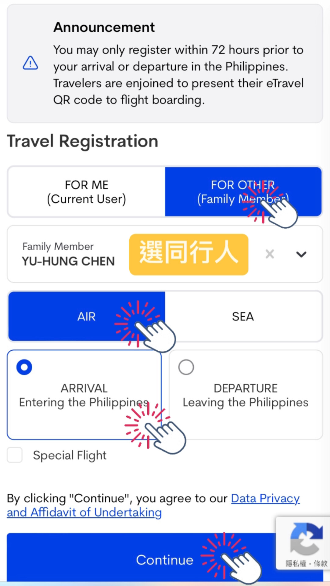 10.選”FOR ME” “AIR” “ARRIVAL ENTERING Philippines” 按Continue進行下一步驟