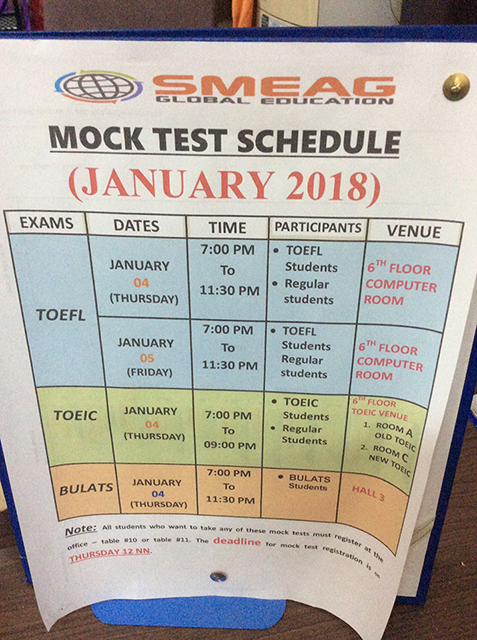 1) SMEAG Capital Campus為ETS授權核宿霧地區考場,但在位於科隆市場附近為ETS主要考場,所以如果本校報名考生數不多,有可能會合併至該考場考試。