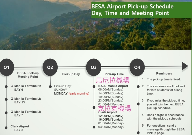 以下為馬尼拉/克拉克-碧瑤校區的聯合接機時間:
