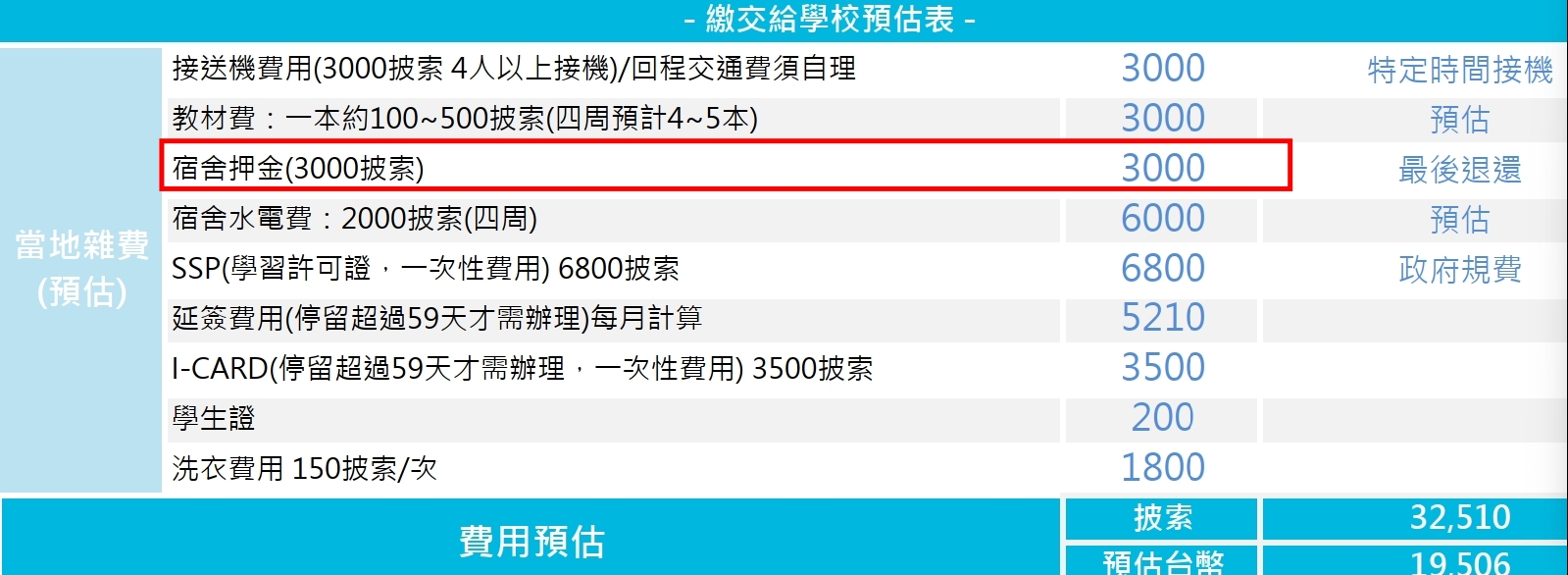 另外,菲律賓的語言學校有一些如果是跟飯店合作的住宿,像是CBOA(學校租用飯店幾層樓作為學生宿舍,此種的學校押金就會再更多一點,依照住宿飯店的押金規定為準,正常會多於5000披索),週數越長住宿押金越多。