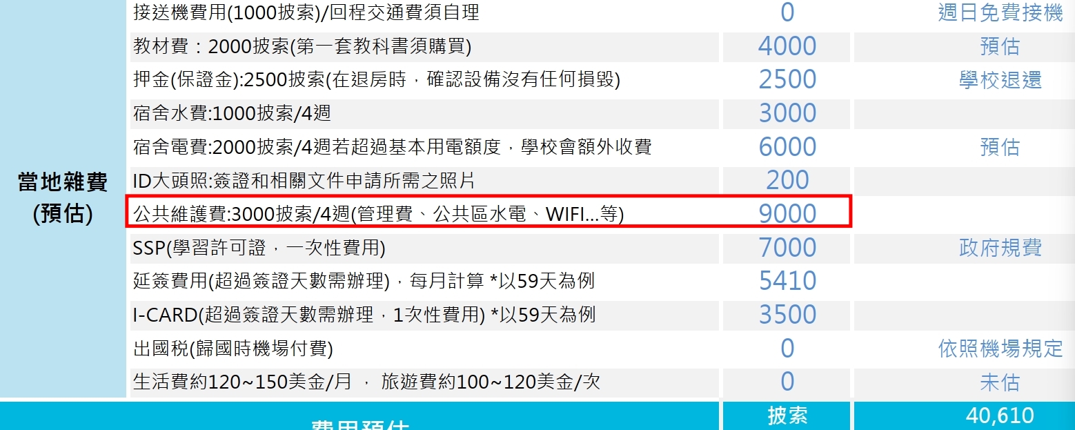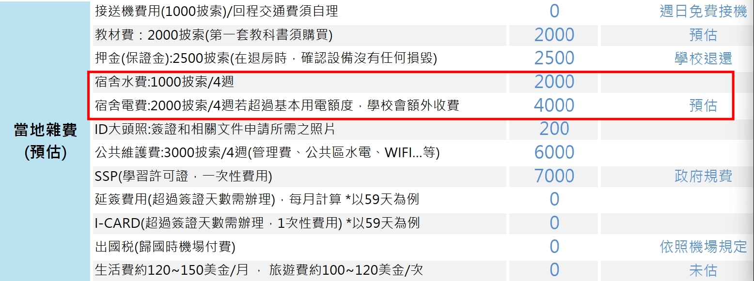 第二部分:抵達學校後繳交的學校雜費(接機、水電、維護管理費等)披索計價