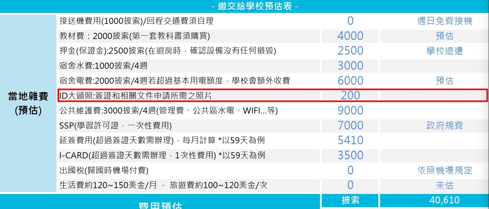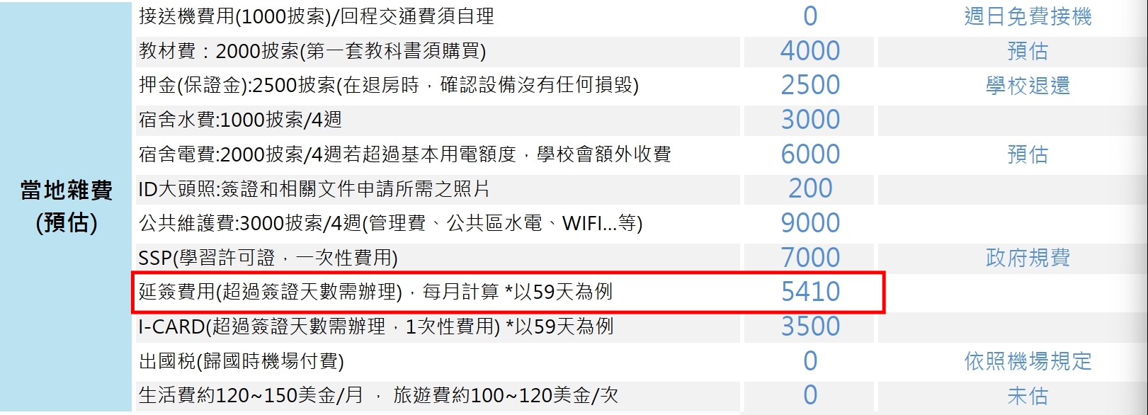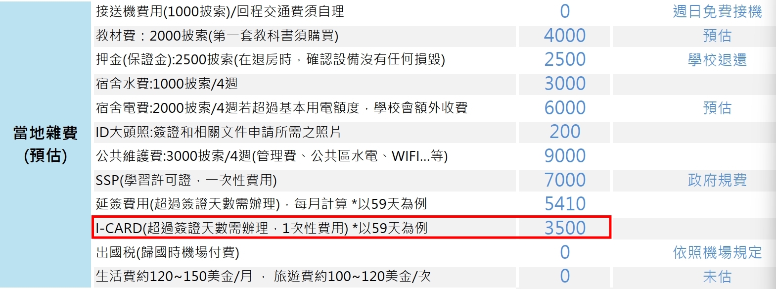 上面延簽費用跟ACR-iCard都是學習超過8周的學生需要繳交,通常兩者是綁在一起的喔!所以一旦是12周的同學,基本上都是會有一筆額外延簽+ACR-iCard加總共8000~9000披索的額外費用(大約加總是5000多台幣)。