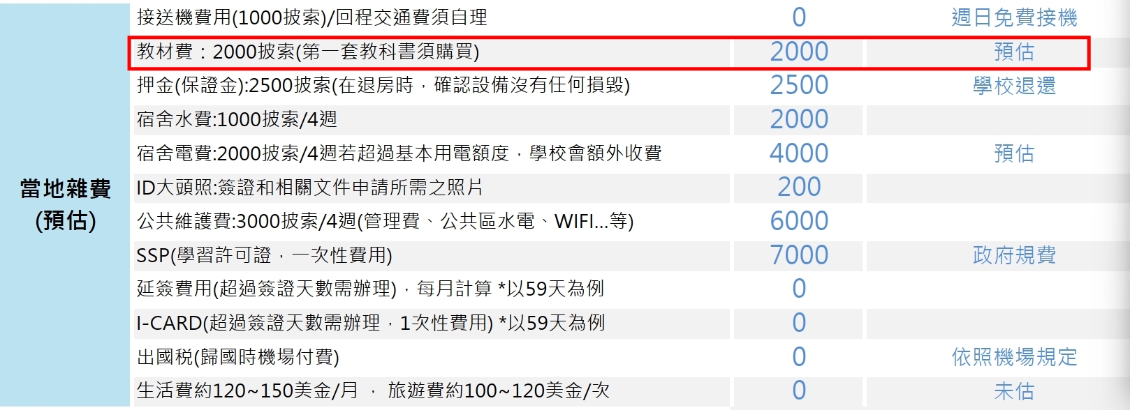 目前學校繳交書籍費的方式有兩種,第一種就是,看一套書多少,大概是1500~2000披索,看學校怎麼收取,如果就讀期間有兩種課程就會收兩套;第二種的話就是依照分級測驗後,學校依照等級所分發的書籍,看一本書多少披索,學校會依照每本多少跟學生收取。基本上也都介於1500~2500披索不等,看書籍費多少就繳交給學校喔!額外提醒,學校分發書籍之後可以檢查課本內容是不是有缺頁或是有污漬,如果你沒有做任何記號的話是可以去跟學校更換哦!另外也可以看一下課程內容對你來說O不OK~