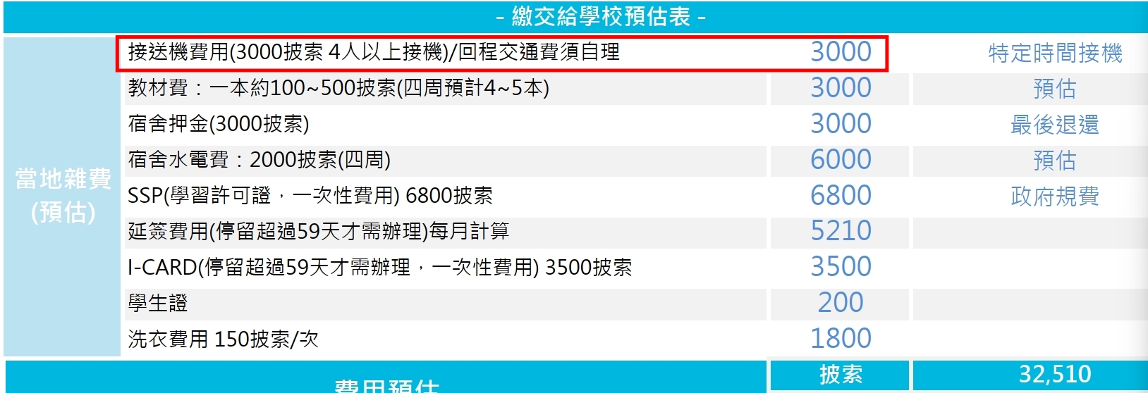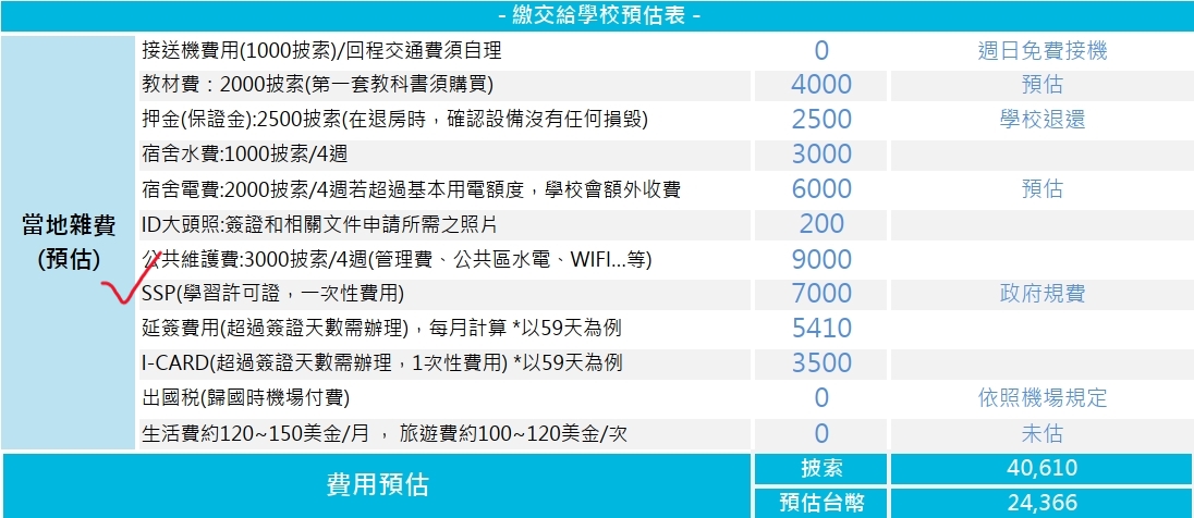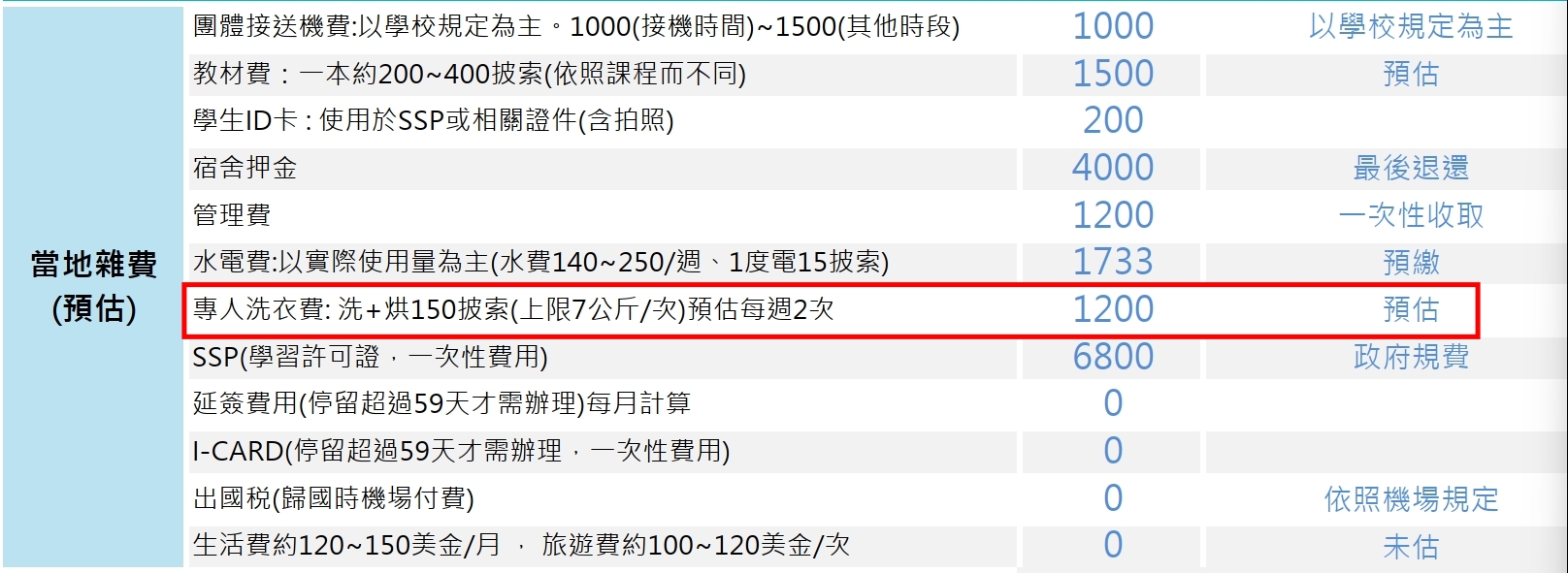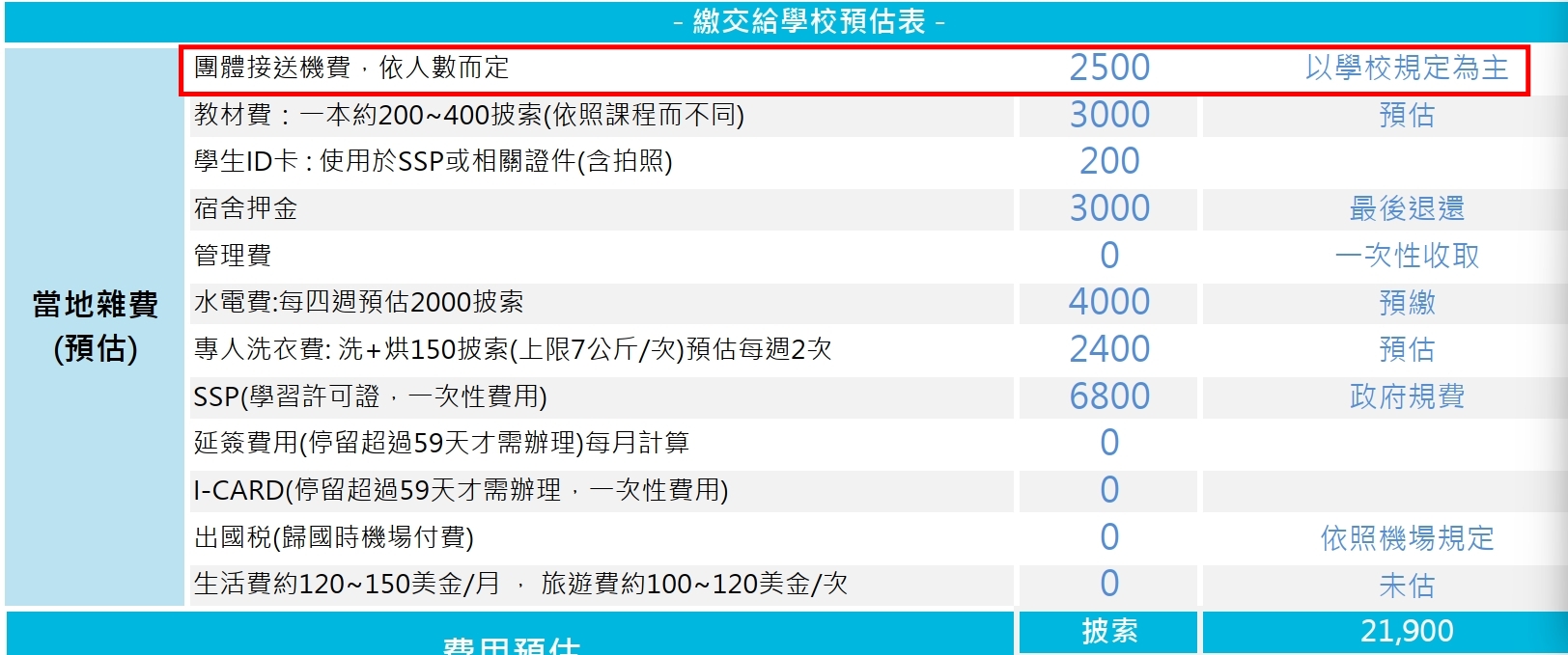 看遊學地區當地政府或學校跑腿辦理服務所收取的費用加總總共是多少喔!如果超過半年,就必須額外再申請另外半年的SSP的!但念超過半年的學生目前比較少。