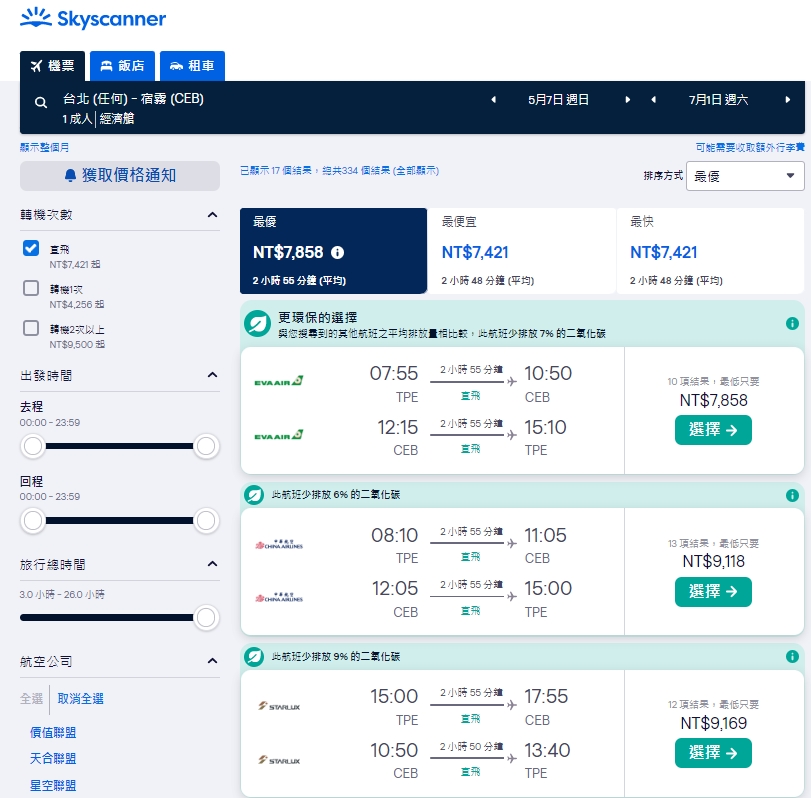 宿霧國際機場(機場代碼CEB):目前有飛的航空公司是(長榮航空、星宇航空與中華航空),撇除寒暑假熱門旅遊的機票的話,目前大部分的來回機票約略落在7500~9000台幣左右的票價喔!