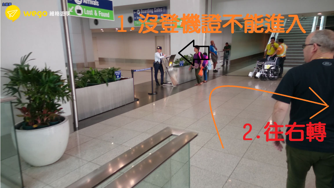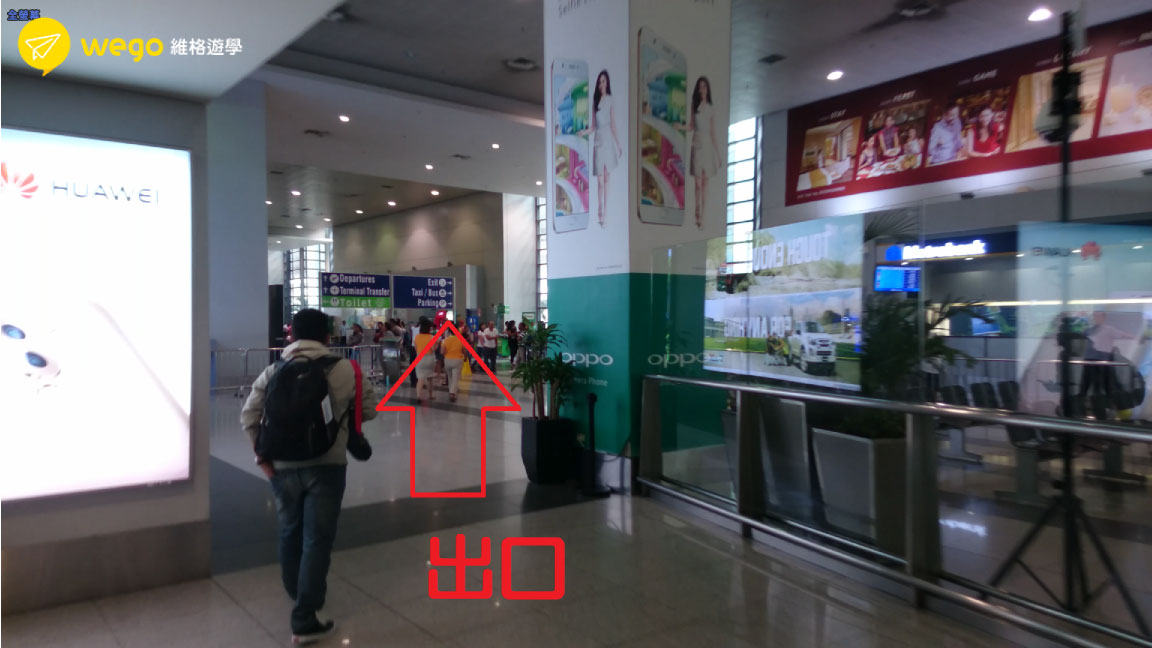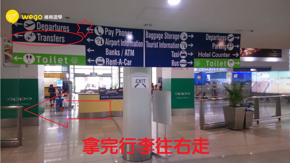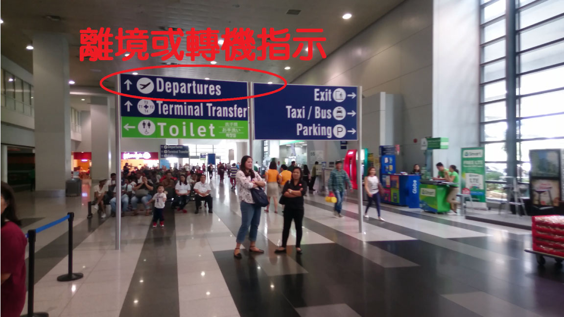 抵達馬尼拉機場時候同學請不用慌張,雖然機場很大、但路線只有一條,跟著遊客人群走就不會錯,把在飛機上已經寫好的入境卡、海關申報書遞交給海關,然後提行李往出口方向走去(綠色Exit),若有須申報物品,記得要誠實申報。