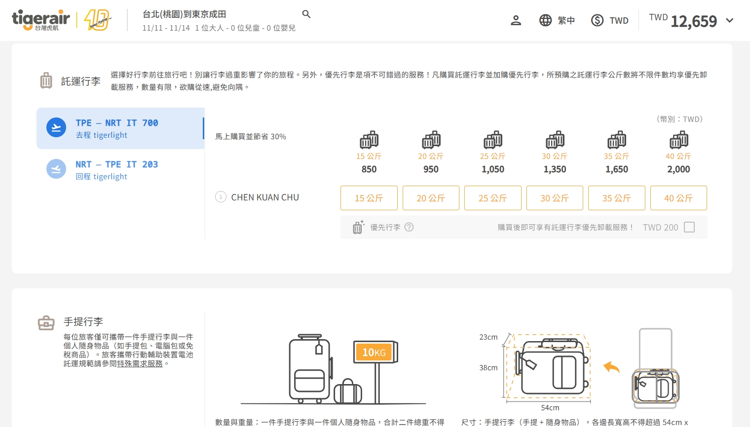 填完個人資料後選購行李,行李加購通常男生20kg足夠,女孩們大概(25kg-30kg)比較夠喔!