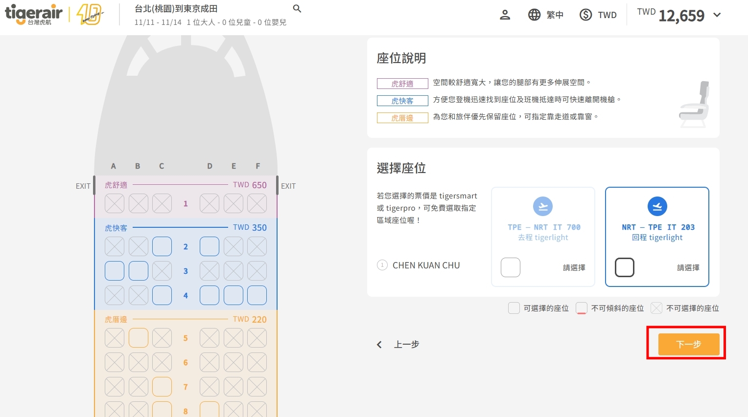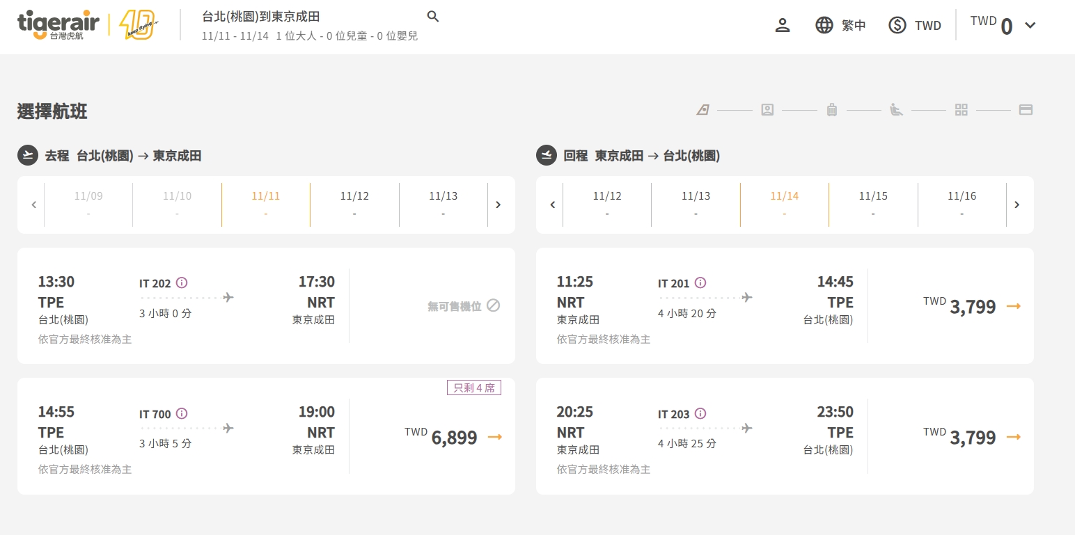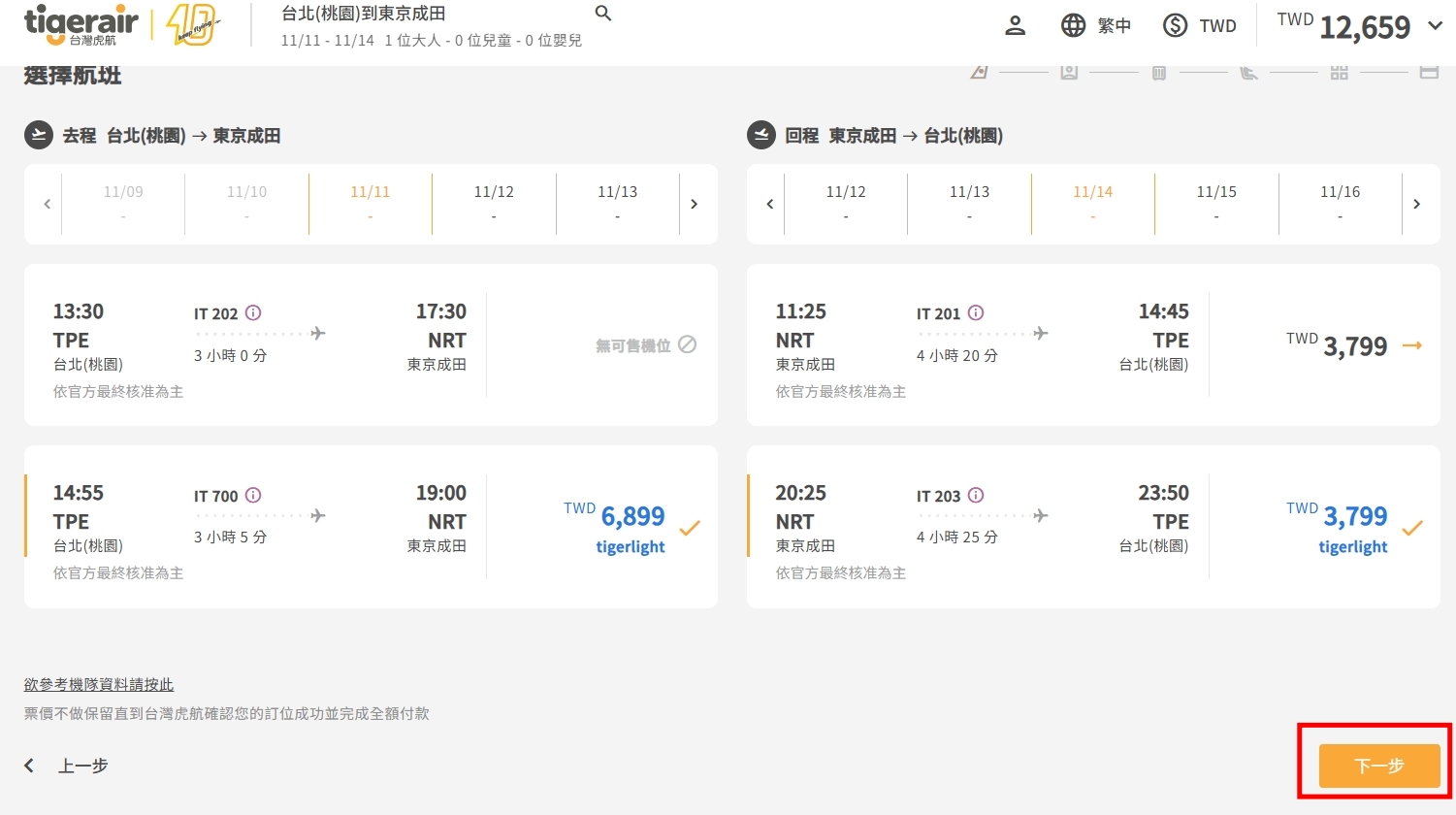 Step.2 台灣虎航訂票-選擇購買的票類型、價格