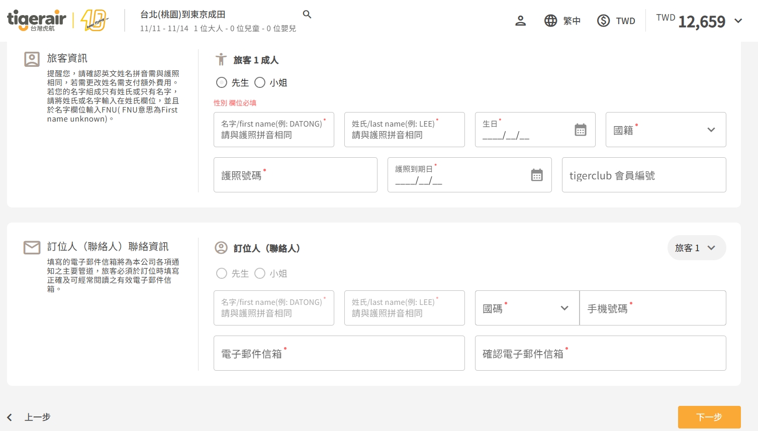 Step.3台灣虎航訂票-輸入個人資料、加購行李公斤數