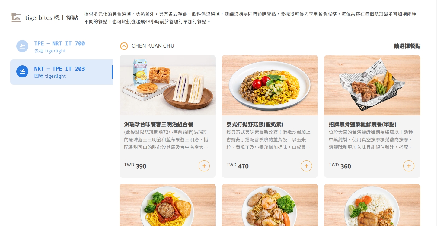 3.tigerpro:有手提行李10KG外,包含20KG的托運行李、選購座位費用、免費機上餐點以及免費變更機票日期時間一次。