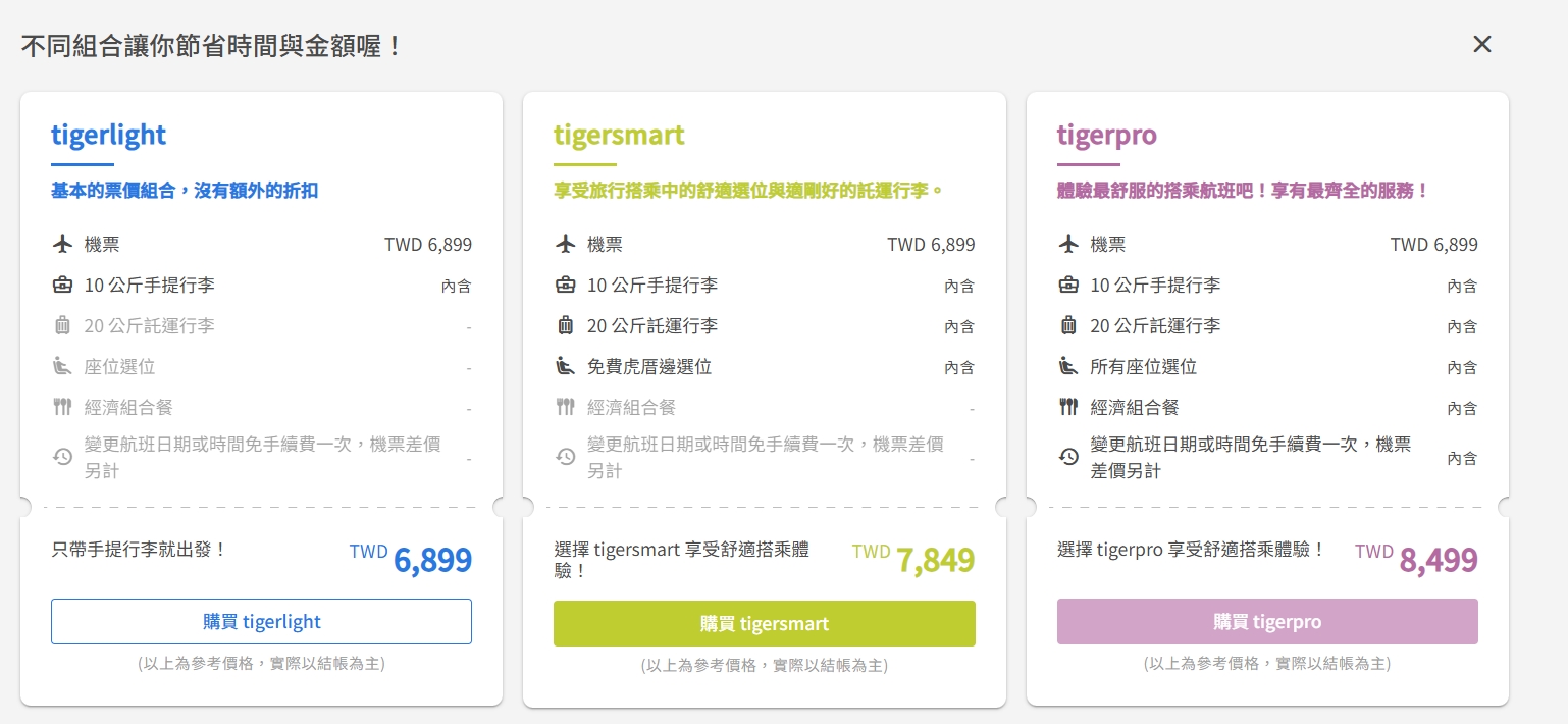 1.tigerlight:虎航最基本票,免費手提行李10KG(最多兩件),托運行李可至下一頁選購。