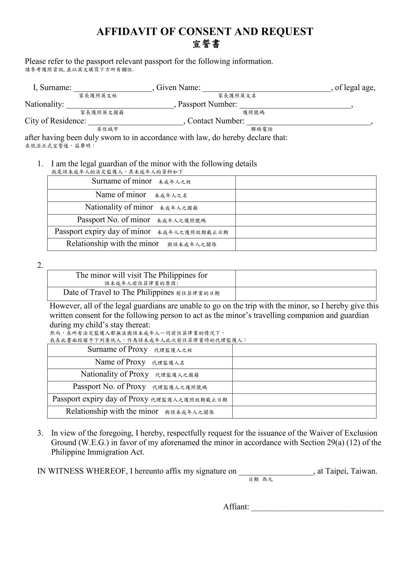 - 若監護人無法陪同,必須委託一名年滿 20 歲的成年人陪同入境,並需辦理 WEG (Waiver of Exclusion Ground) 公證文件。