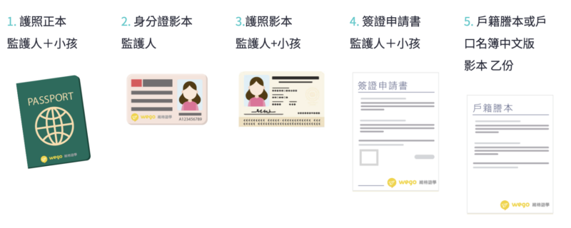 (1)監護人:1.護照正本2.護照影本3.身分證正反影本 4.簽證申請書
