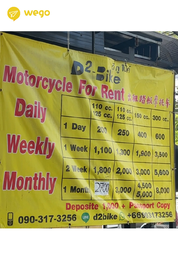 - 租金: 依摩托車車型CC數與租期不同,約200-500泰銖/天。
